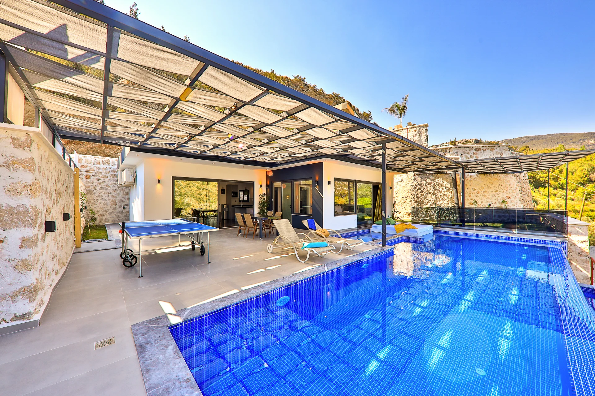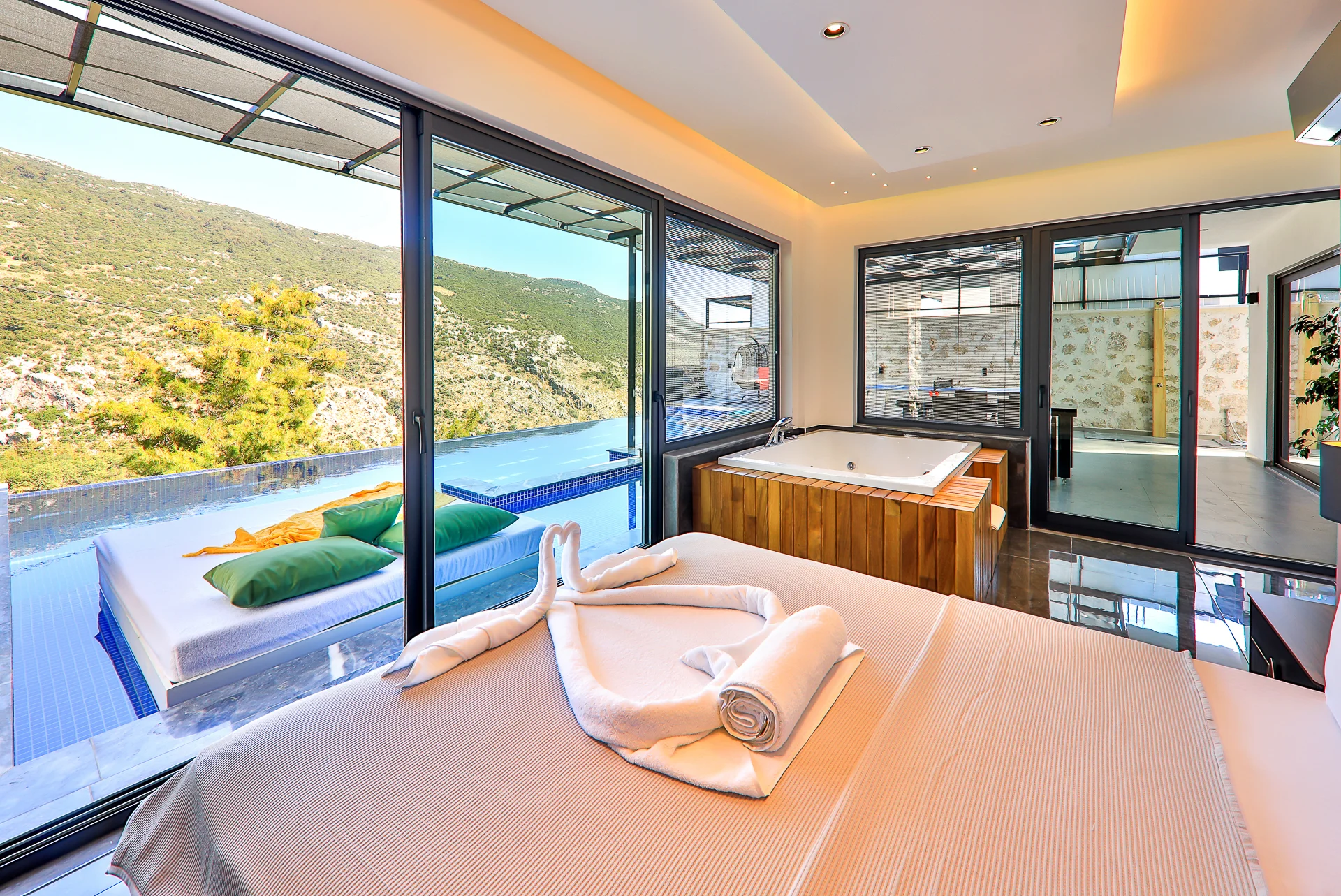 Villa Akdeniz 1, Antalyaʼnın Kaş ilçesinin Kalkan İslamlar beldesinde bulunan, 2 kişi kapasiteli tatil villamızdır. Panoramik doğa manzarasına sahip olan villamız, özel yüzme havuzunun etrafı gözlerden uzak, muhafazakar bir yapıya sahiptir. Kalkan merkeze 10 km mesafededir.Yatak odasında jakuzi bulunmaktadır. Sinema odası mevcuttur. Balayı çiftlerimiz için lüks bir tatil fırsatı sunulmaktadır. Salon : Villamızın salonunda ; oturma grubu, sehpa, TV, uydu alıcı, klima ve kablosuz modem yer almaktadır. Mutfak : Modern Amerikan mutfakta; bulaşık makinesi, buzdolabı, ankastre fırın, mikrodalga fırın, ankastre 4’lü ocak, elektrikli su ısıtıcı, tencere ve tava takımı, yemek takımı, kaşık-çatal takımı ve bardaklar bulunmaktadır. Yatak Odaları: 1. Yatak Odası: 1 adet çift kişilik yatak, klima, komodin, makyaj masası, elbise dolabı, jakuzi ve banyo tuvalet bulunmaktadır. Havuz Boyutu: En: 3,5 m Boy: 12 m Derinlik: 1,60 m Kapalı Havuz Boyutu: En: 2 m Boy: 4 m Derinlik: 90 cm Depozito : Villaya girişte 5000 TL depozito alınmaktadır. Herhangi bir hasar, kırık dökük, kayıp gibi problemler olmadığı taktirde villadan ayrılıştan 10 dk. önce villa/apart kontrol edilip depozito misafirimize iade edilmektedir. Tüm villalarımıza ilk gün giriş saati öğleden sonra 16.00, en son gün villadan ayrılma saati sabah 10.00’dur. Aradaki zaman diliminde temizlik yapıldığı için Villaya/Aparta giriş saatinizden erken gelmeniz durumunda size yardımcı olamayacağımızı belirtmek isteriz. Lütfen villaya giriş ve çıkış saatlerine uyunuz . Not: Doğa içerisinde konuma sahip olan tüm villalarımızda düzenli olarak ilaçlama yapılmaktadır. Buna rağmen çevrede; kelebek, böcek, sinek vs. bulunma ihtimali vardır.Havuzu korunaklı villalarımızda kesinlikle %100 görünmememe garantisi vermemekteyiz bu villalarımızda her zaman %5 sakınma payı mevcuttur.