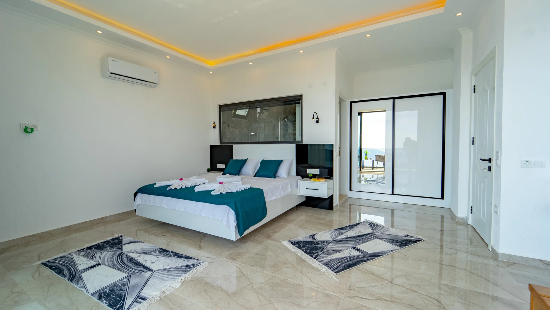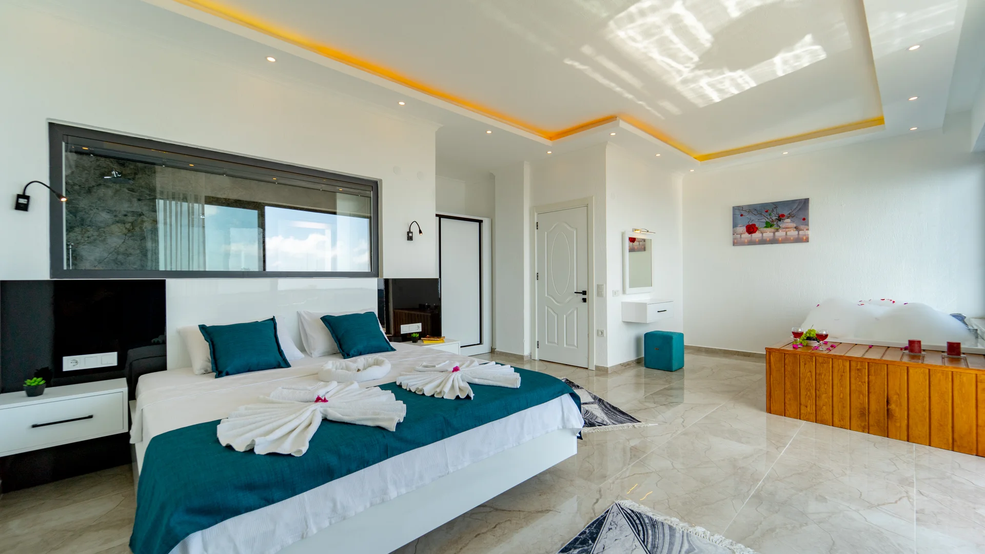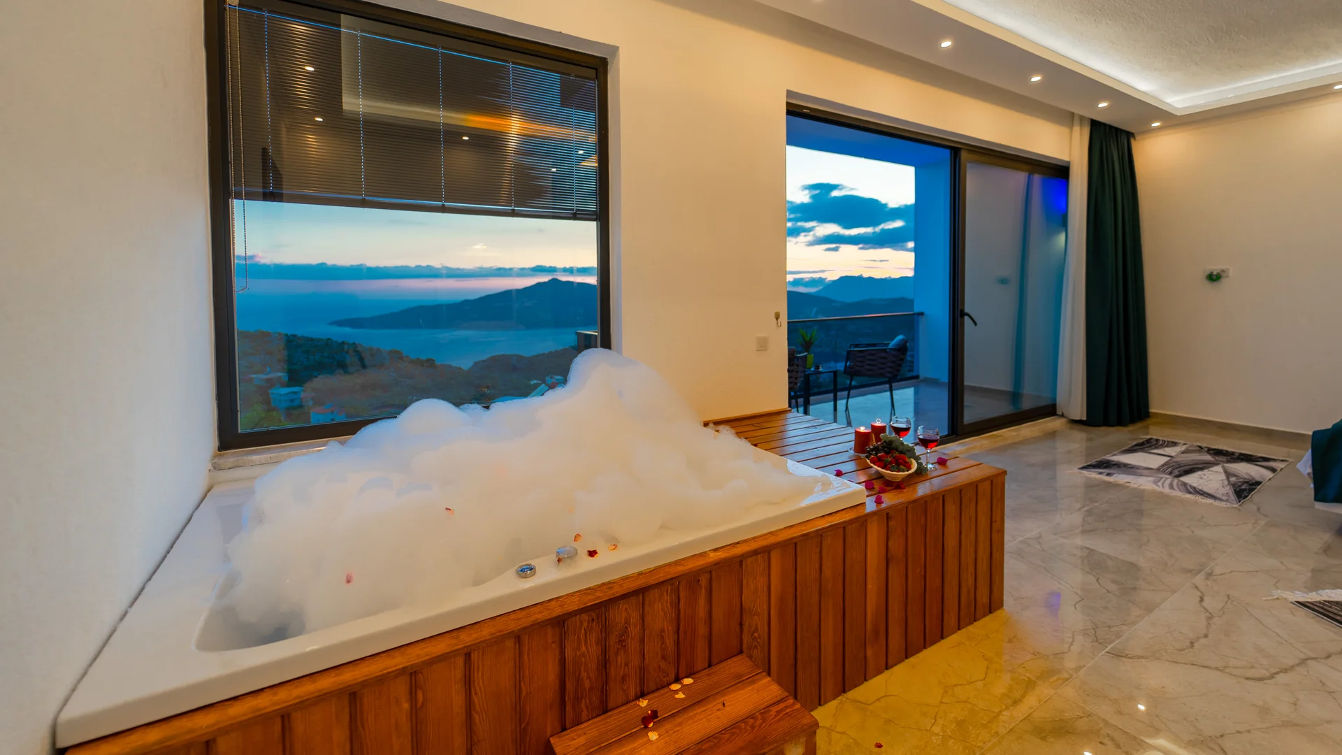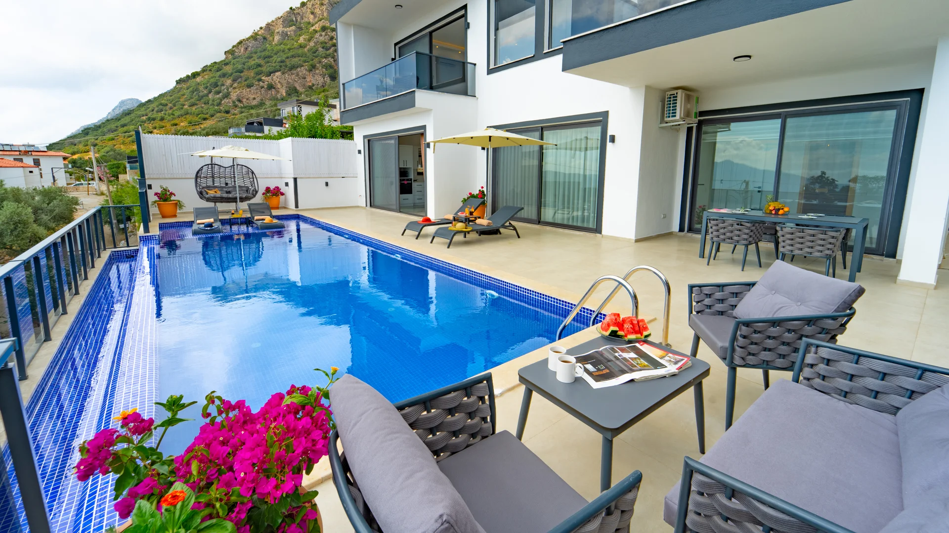 Kaş Kalkan Bölgesinde 2 Yatak Odasına Sahip 4 Kişilik konaklama kapasiteli merkeze ve denize yakın sizlere unutulmaz bir tatil tecrübesi sunacak lüks bir tatil villasıdır. Doğa ve Deniz manzarasına sahip bu villamız muhafazakar tatil arayışı olan aileler ve balayı çiftlerimiz için de uygun bir villa seçeneğidir. Saunaya sahip bu kiralik villa kış aylarında da tercih edilebilir bir villa alternatifidir. Salon: Villamızın salonu içerisinde, koltuk takımı, orta sehpa, TV, TV ünitesi, klima, uydu alıcısı yer almaktadır. Mutfak: Yazlığımızın Amerikan mutfağı içerisinde, buzdolabı, bulaşık makinası, çamaşır makinası, yemek masası, yemek takımı, ankastre fırın, mikrodalga fırın, tost makinası, ankastre ocak, çaydanlık, su ısıtıcısı, çocuk masası, tava, tencere takımı ve gerekli olan tüm mutfak gereçleri yer almaktadır. Yatak Odaları: 1. Yatak Odası : 1 adet çift kişilik yatak, klima, elbise dolabı, komodin, makyaj masası, jakuzi, banyo ve tuvalet alanları bulunmaktadır. 2. Yatak Odası : 2 adet tek kişilik yatak, klima, elbise dolabı, komodin, makyaj masası, banyo ve tuvalet bulunmaktadır. Havuz Boyutu: En: 3,5 m Boy: 10 m Derinlik: 1,50 m