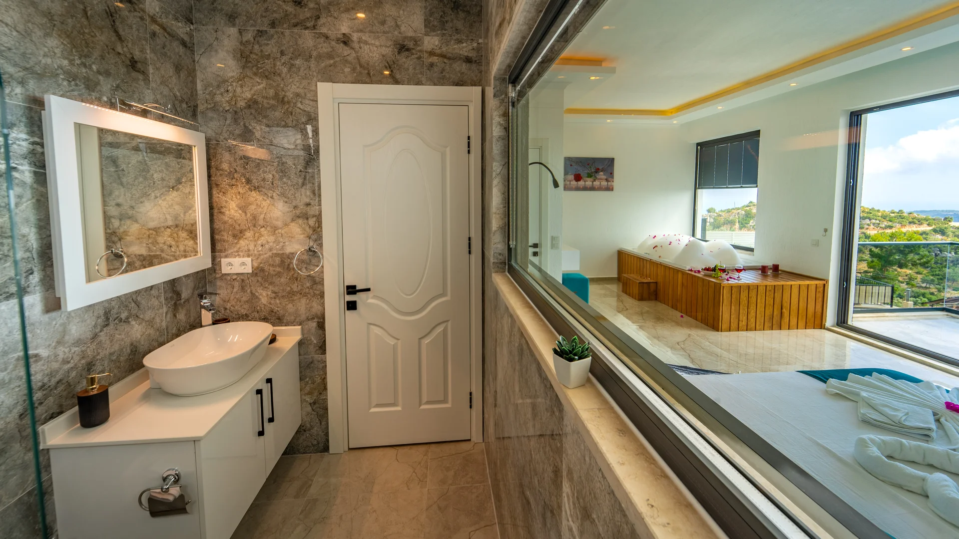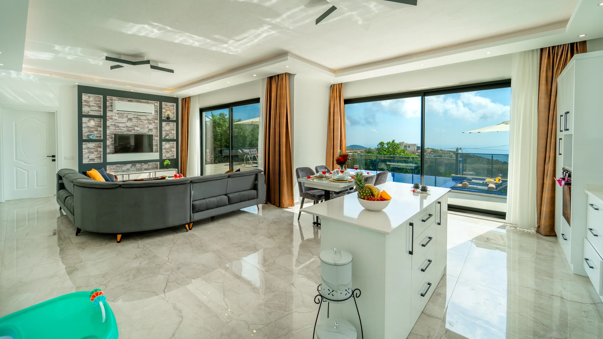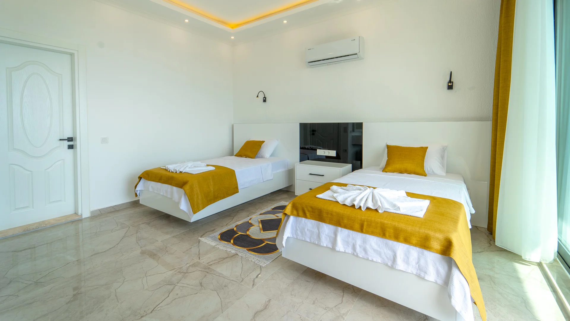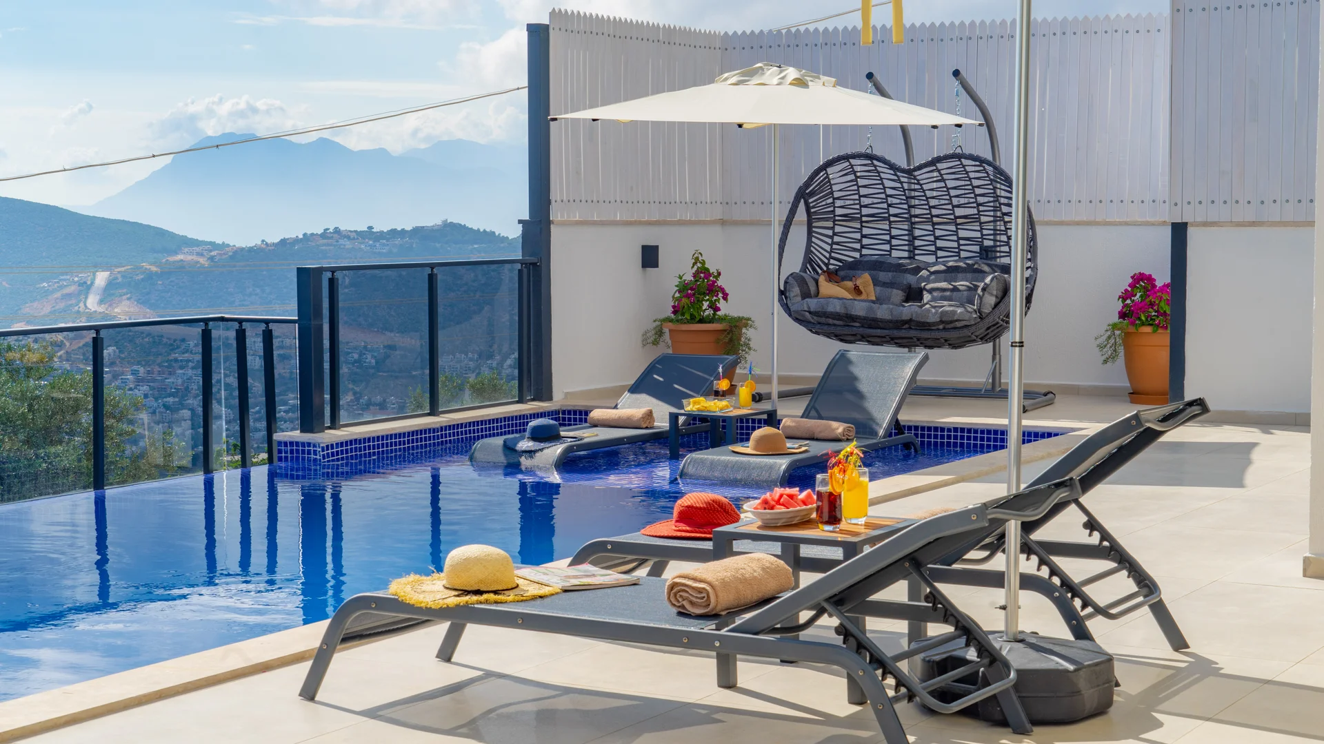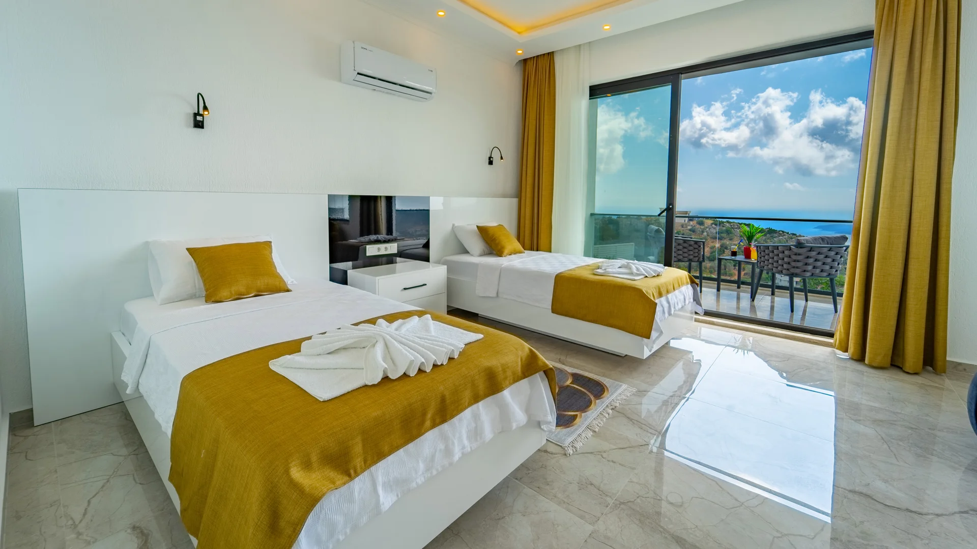 Kaş Kalkan Bölgesinde 2 Yatak Odasına Sahip 4 Kişilik konaklama kapasiteli merkeze ve denize yakın sizlere unutulmaz bir tatil tecrübesi sunacak lüks bir tatil villasıdır. Doğa ve Deniz manzarasına sahip bu villamız muhafazakar tatil arayışı olan aileler ve balayı çiftlerimiz için de uygun bir villa seçeneğidir. Saunaya sahip bu kiralik villa kış aylarında da tercih edilebilir bir villa alternatifidir. Salon: Villamızın salonu içerisinde, koltuk takımı, orta sehpa, TV, TV ünitesi, klima, uydu alıcısı yer almaktadır. Mutfak: Yazlığımızın Amerikan mutfağı içerisinde, buzdolabı, bulaşık makinası, çamaşır makinası, yemek masası, yemek takımı, ankastre fırın, mikrodalga fırın, tost makinası, ankastre ocak, çaydanlık, su ısıtıcısı, çocuk masası, tava, tencere takımı ve gerekli olan tüm mutfak gereçleri yer almaktadır. Yatak Odaları: 1. Yatak Odası : 1 adet çift kişilik yatak, klima, elbise dolabı, komodin, makyaj masası, jakuzi, banyo ve tuvalet alanları bulunmaktadır. 2. Yatak Odası : 2 adet tek kişilik yatak, klima, elbise dolabı, komodin, makyaj masası, banyo ve tuvalet bulunmaktadır. Havuz Boyutu: En: 3,5 m Boy: 10 m Derinlik: 1,50 m