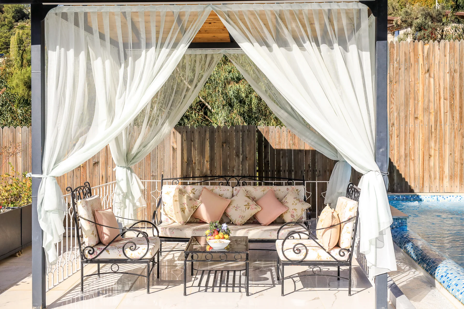 Предлагает частный бассейн и сад с существенно ограниченной видимостью извне.