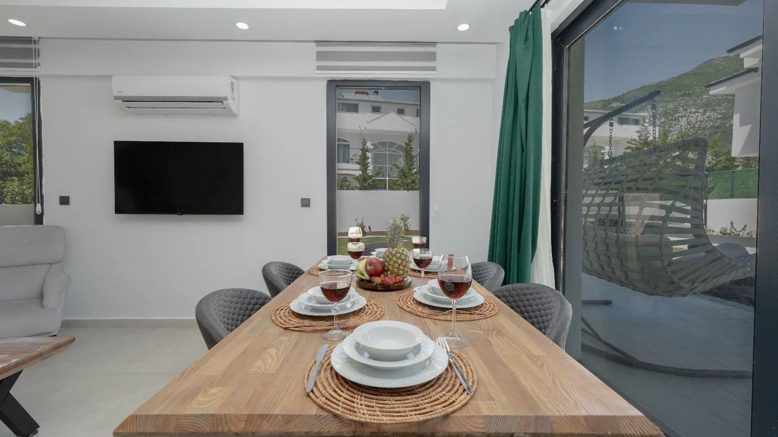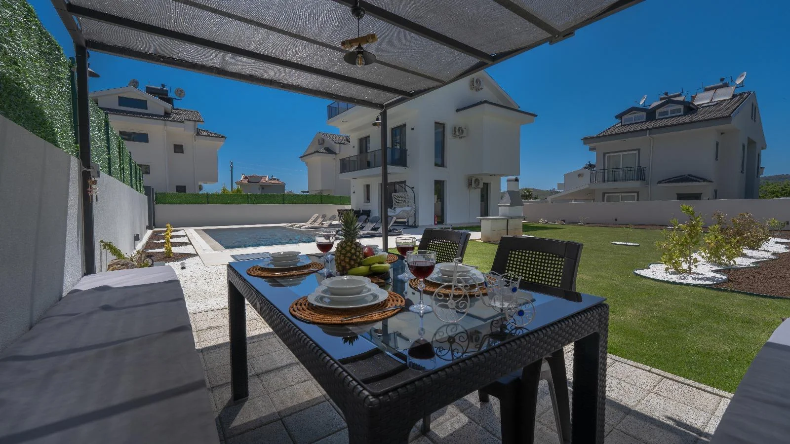 Muğla/Fethiye/Ölüdeniz bölgesinde yer alan 3 yatak odalı 6 kişi kapasiteli tatil villasıdır. Dünyaca ünlü Ölüdeniz Halk plajına 4 km konumda ola villamız geniş aile ve arkadaş grupları için oldukça ideal bir konumda yer almaktadır. Villamızın ana yatak odasında çift kişilik jakuzi de yer almaktadır. Villa Tahancı 1 Havuz Ölçüleri Nedir? Genişilik: 6 M | Uzunluk: 8 M | Derinlik: 1.50 M üm villalarımızın giriş saati öğleden sonra 16:00, çıkış saati ise sabah 10:00’dur. Salon: Oturma grubu, Uydu TV, 6 Kişilik yemek masası, Klima, Havuz kenarına çıkış bulunmaktadır. Mutfak: Buzdolabı, Bulaşık makinesi, Çamaşır makinesi, Mikrodalga, Fırın, 4’lü Ocak, Elektrikli su ısıtıcı, 6 kişilik yemek takımı, Tava, Tencereler, Çatal bıçak vb. bulunmaktadır.