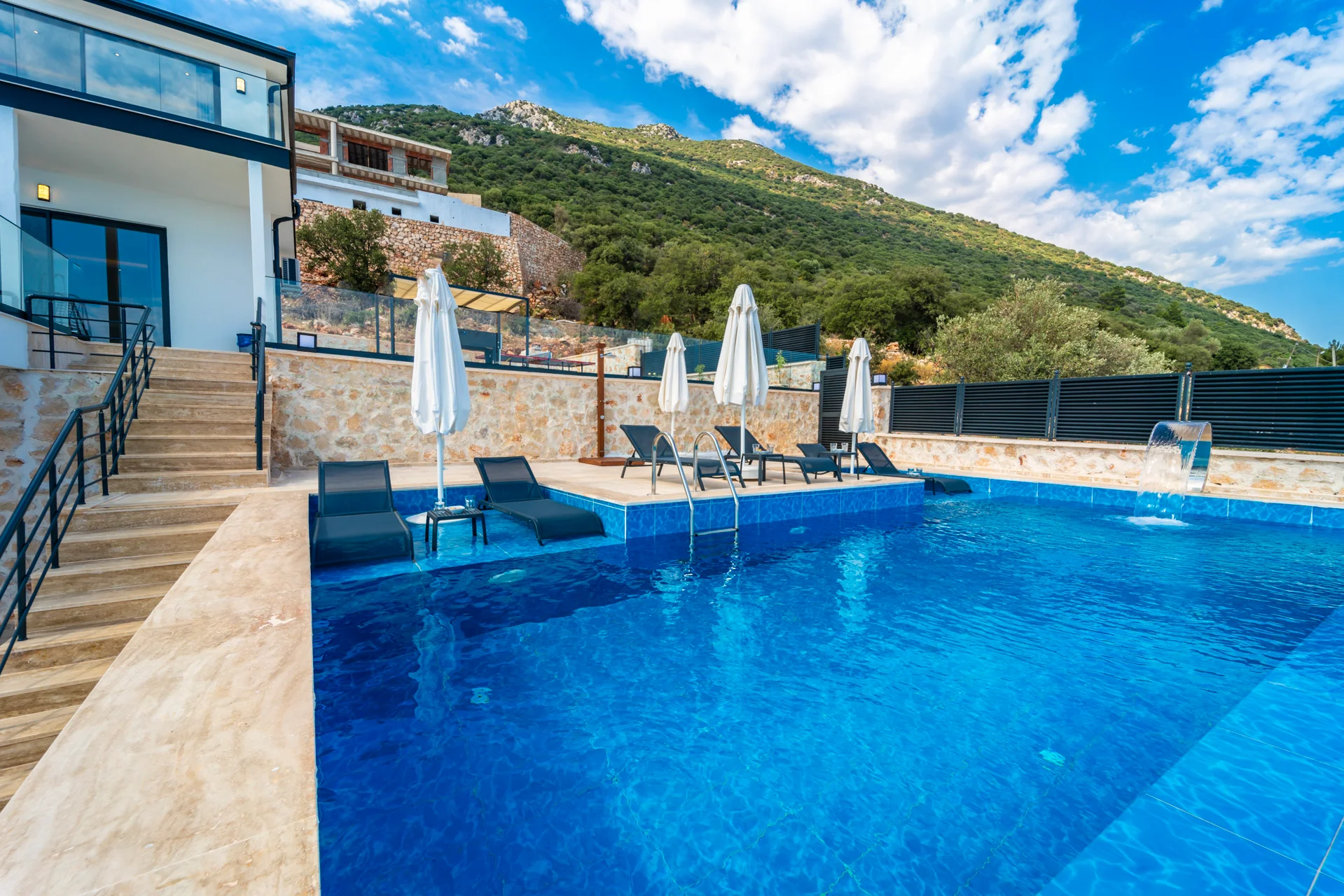 Offers a private pool and garden area with visibility from outside largely restricted.