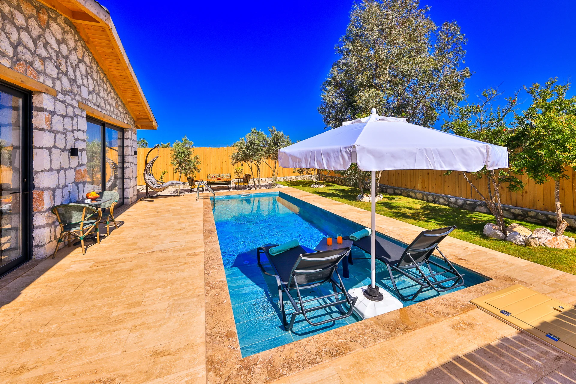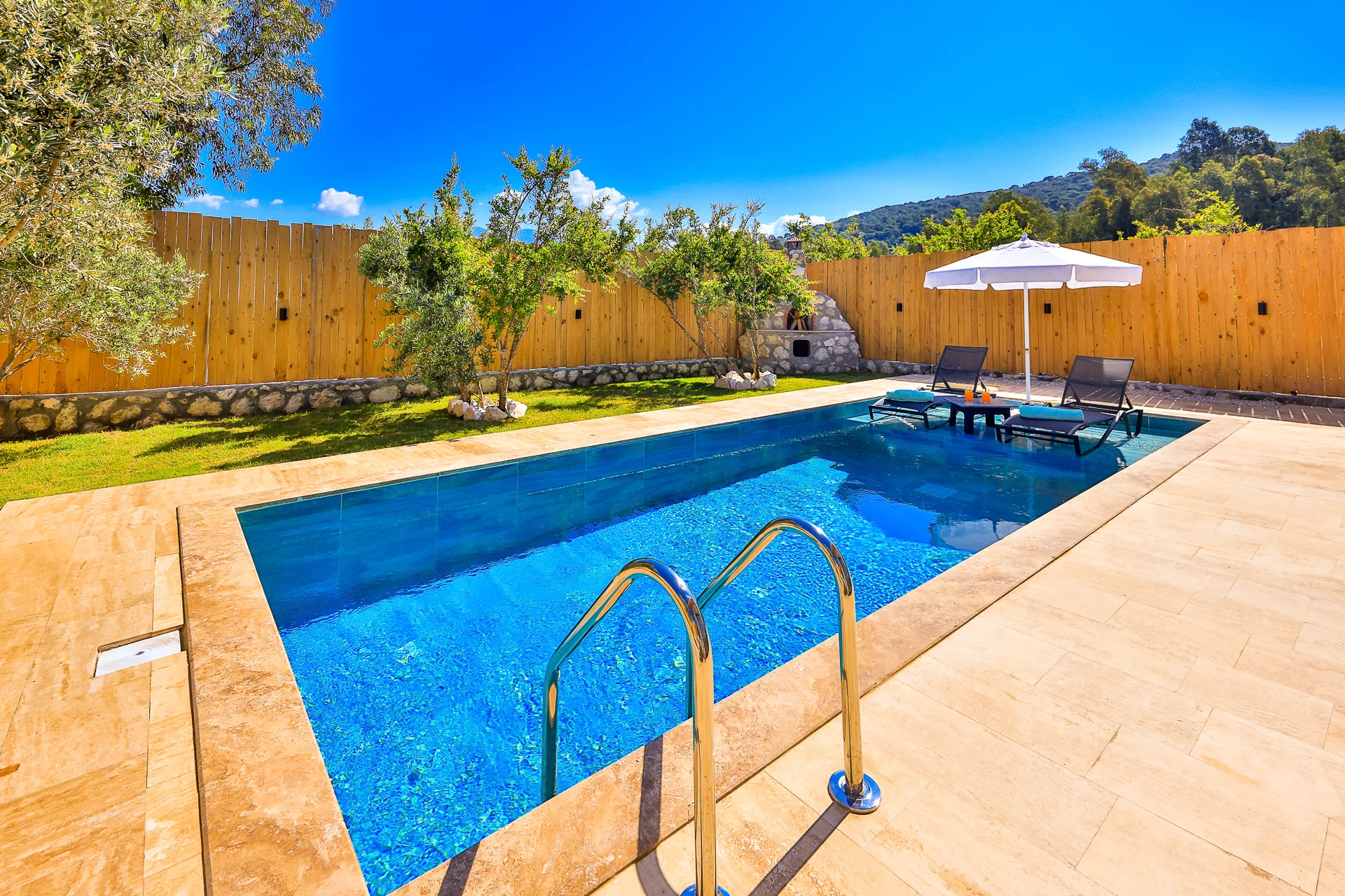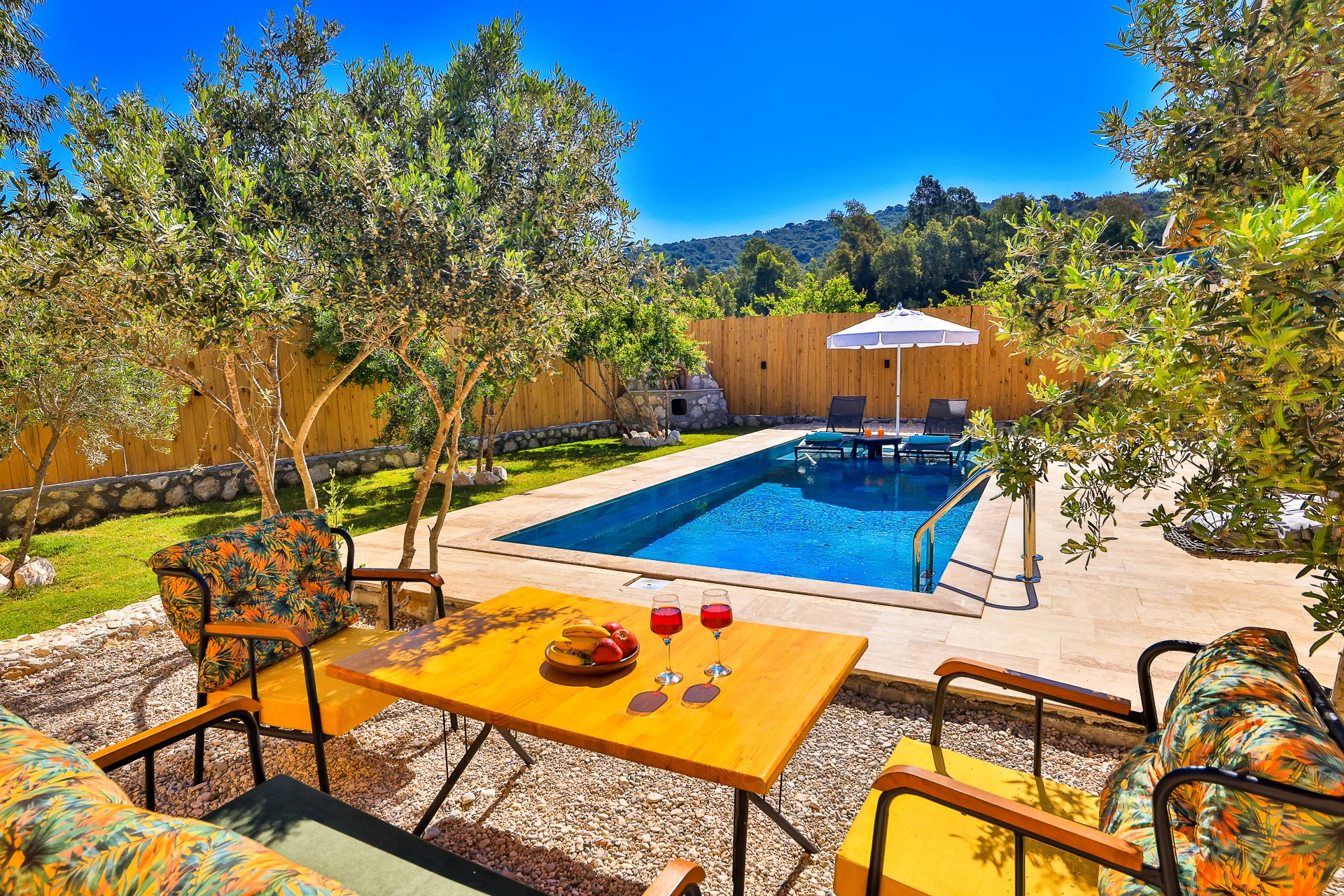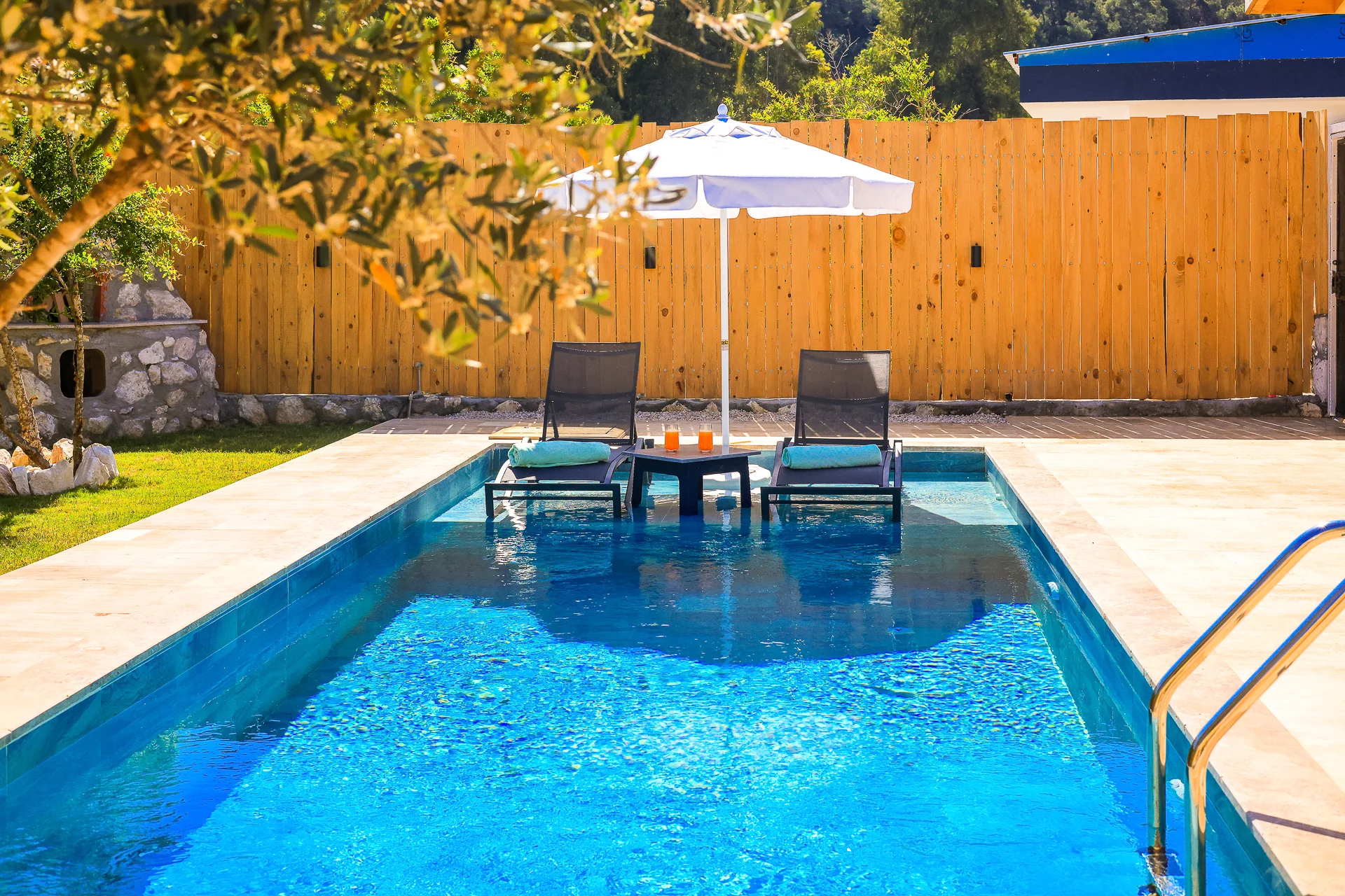 Offers a private pool and garden area with visibility from outside largely restricted.