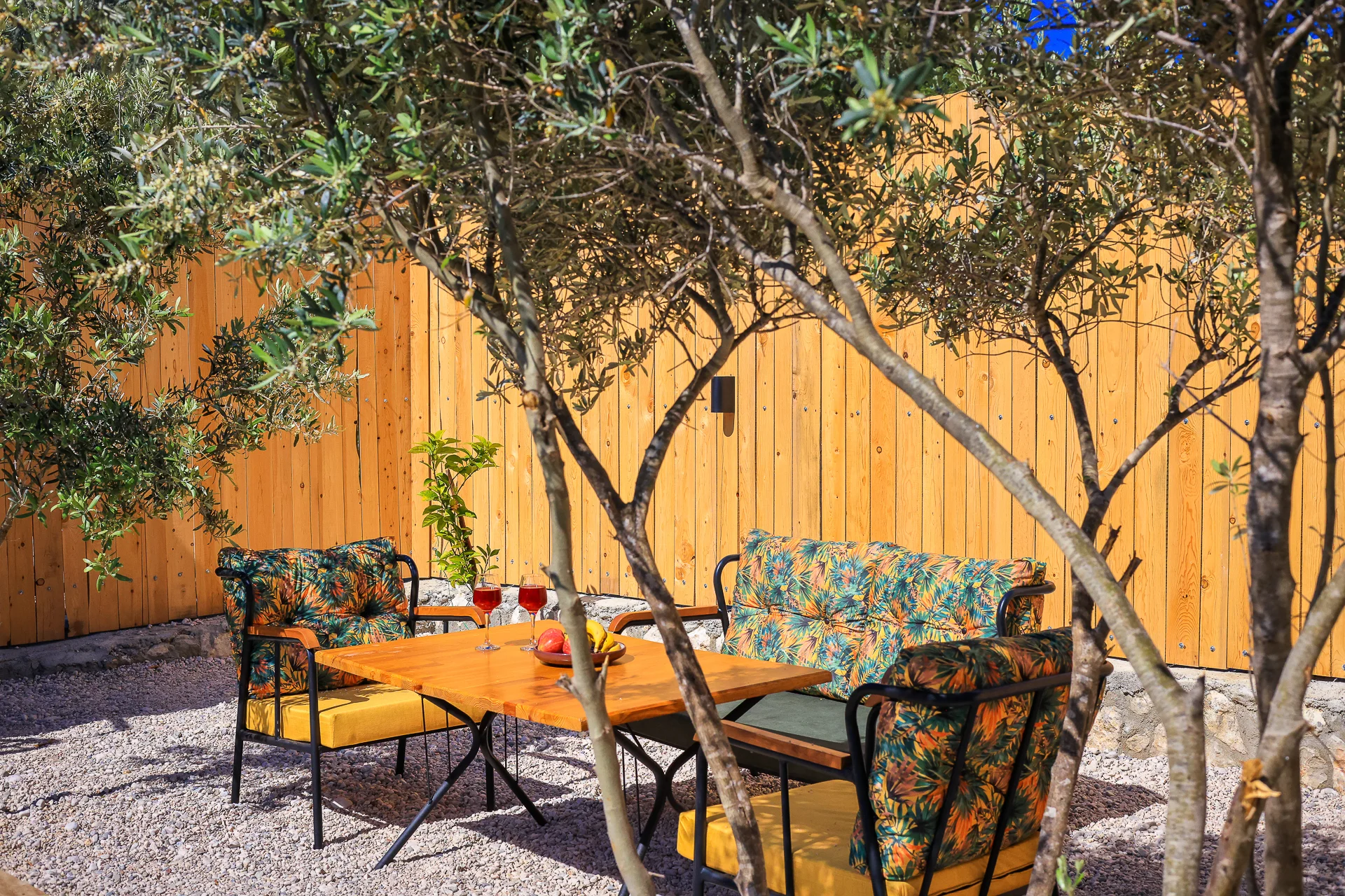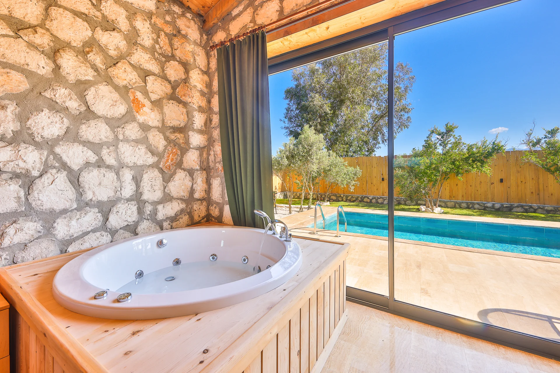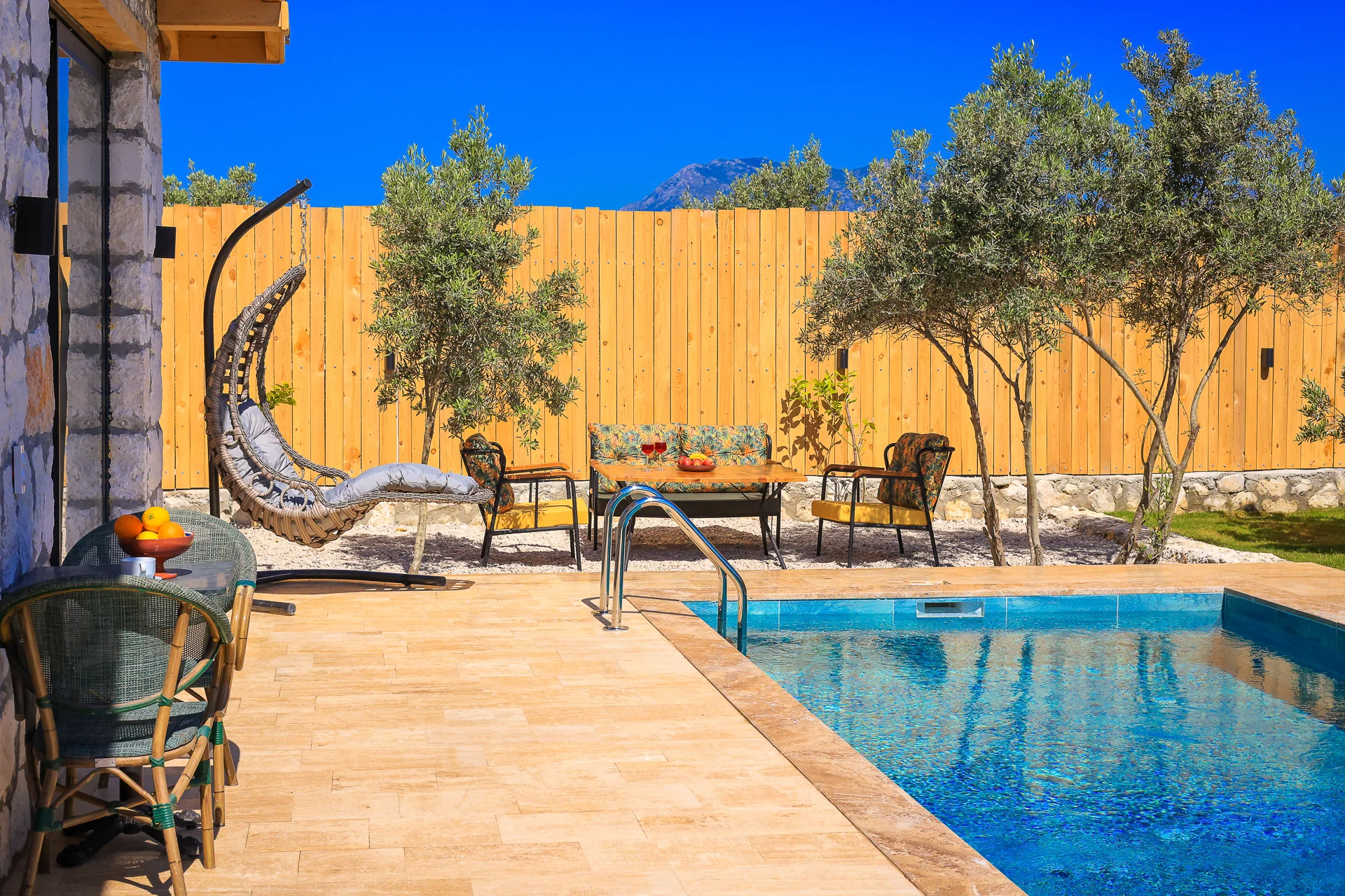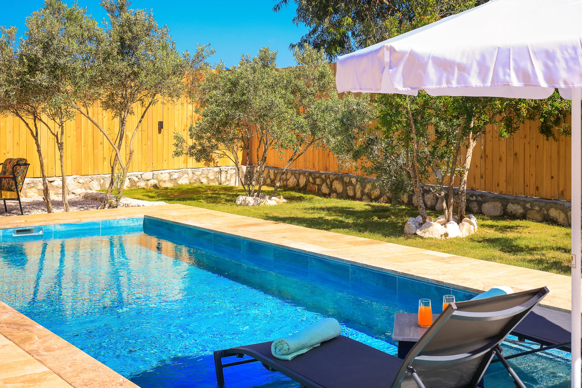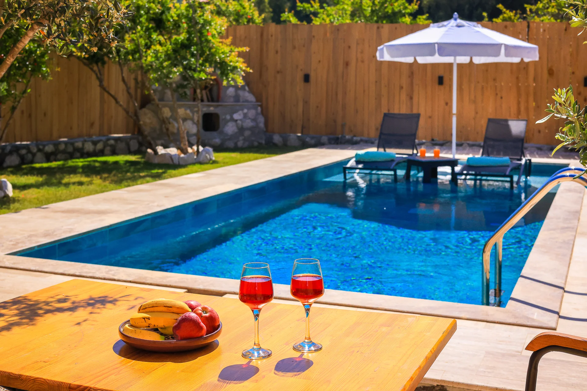 Offers a private pool and garden area with visibility from outside largely restricted.
