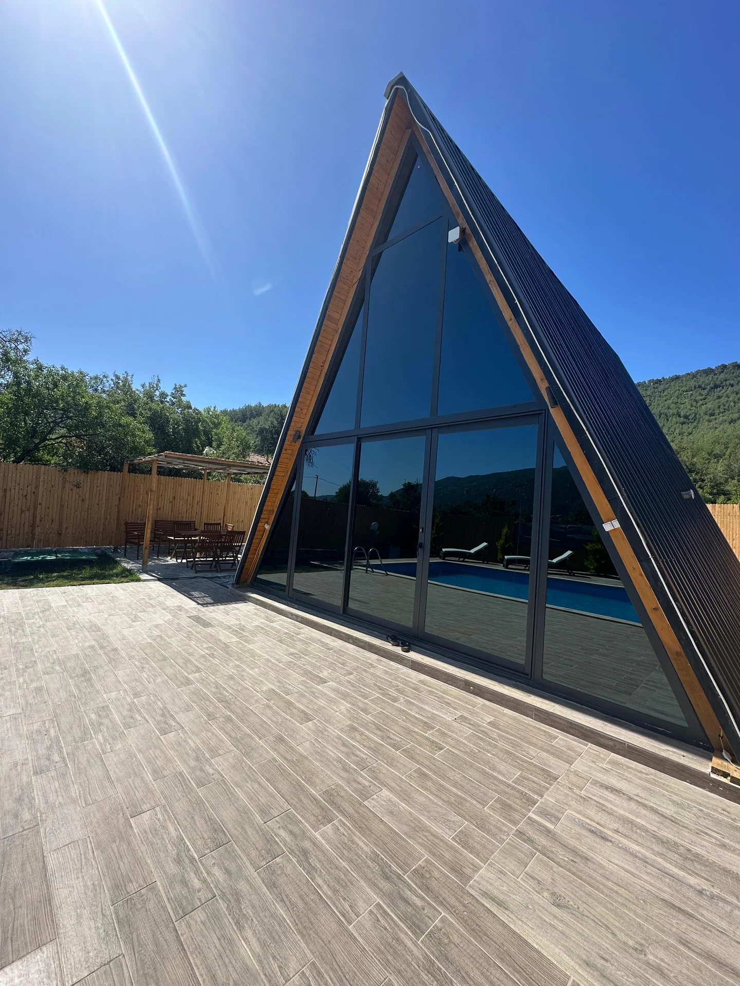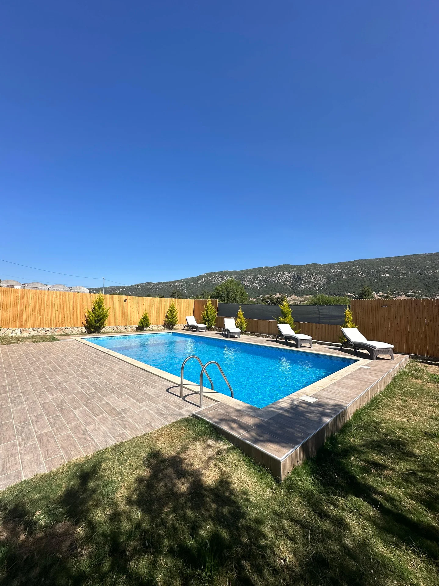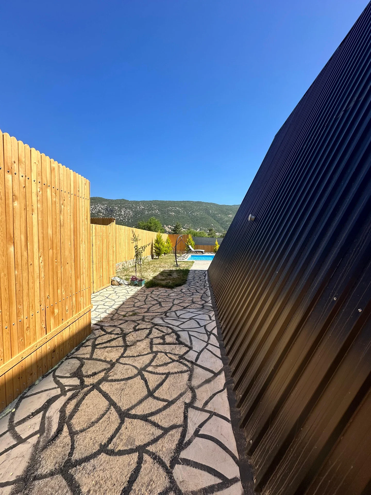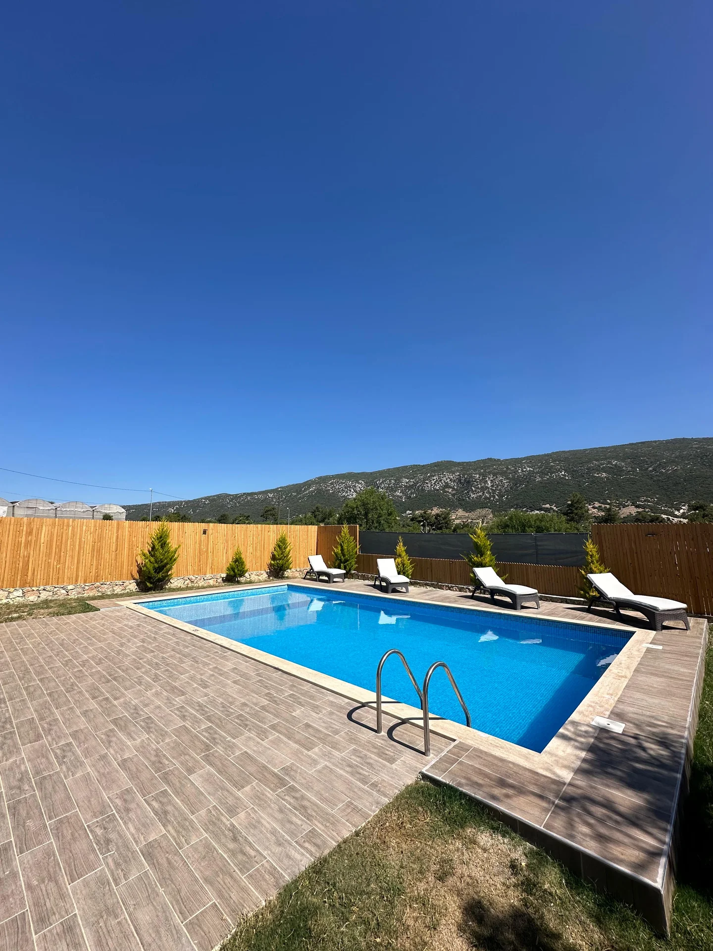 Offers a private pool and garden area with visibility from outside largely restricted.