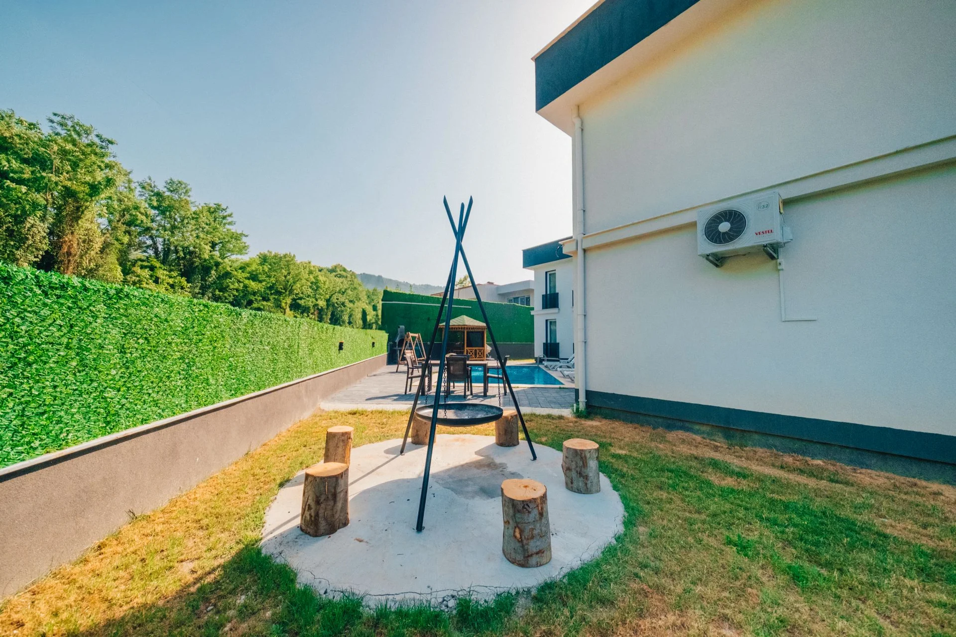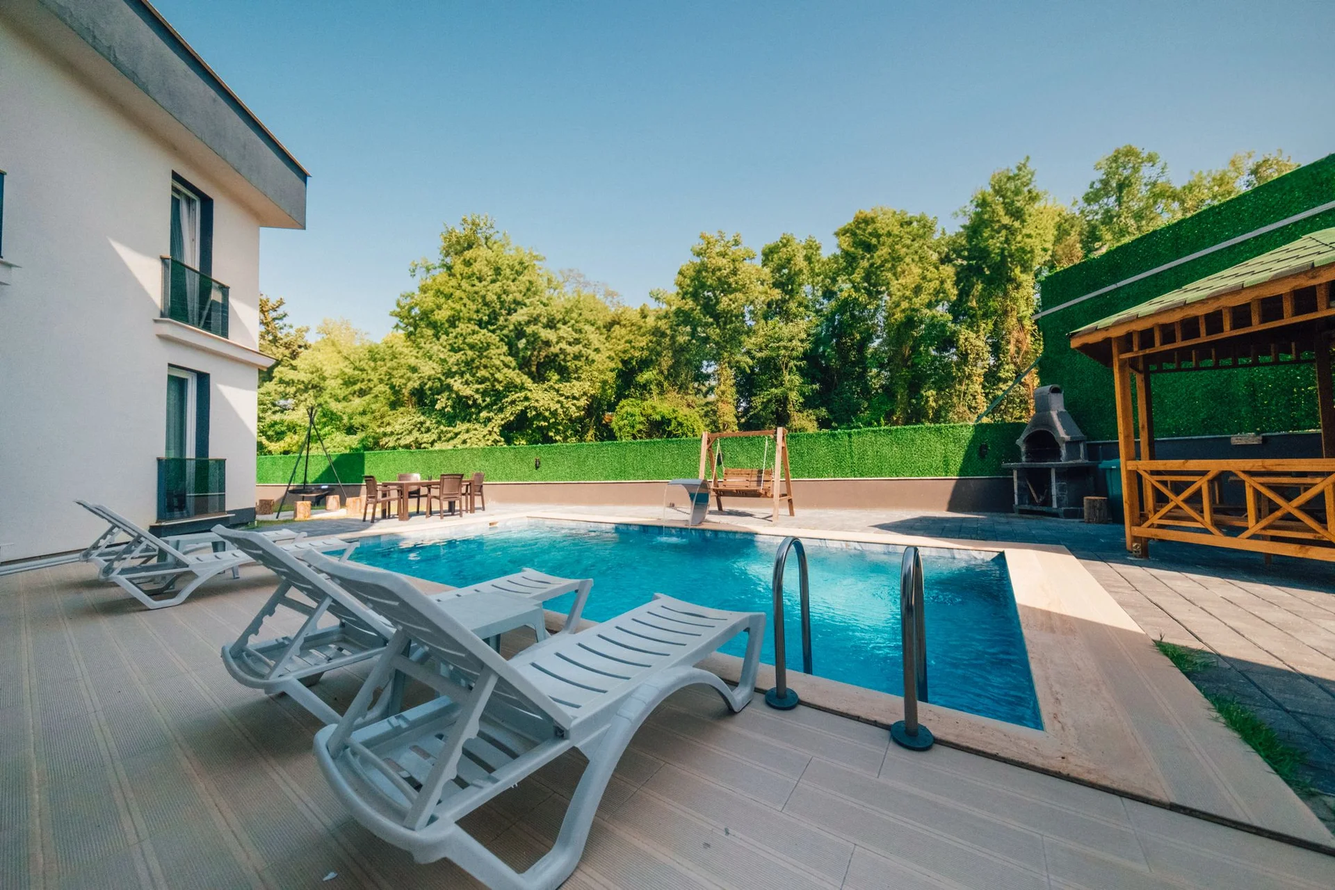 Offers a private pool and garden area with visibility from outside largely restricted.