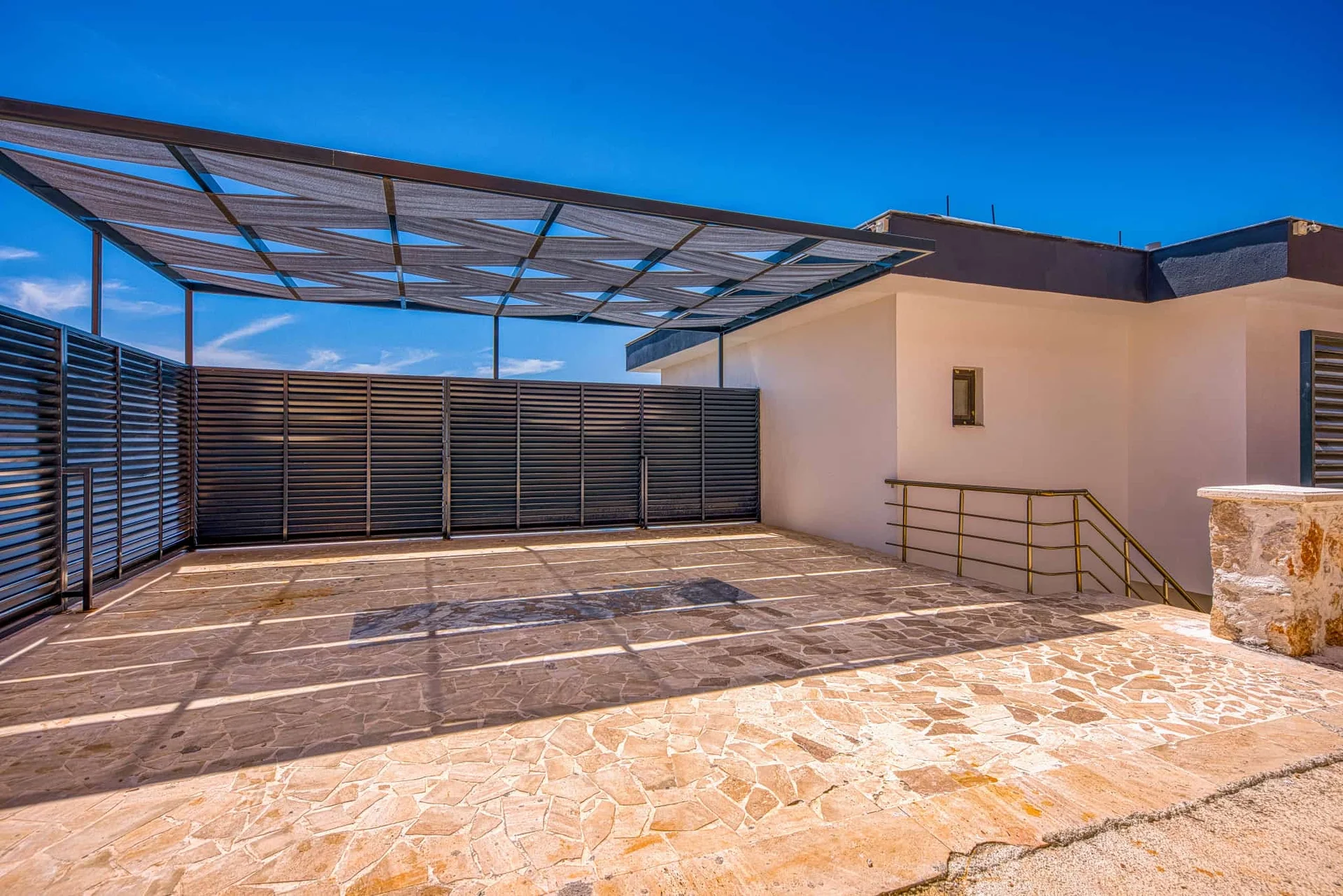 Offers a private pool and garden area with visibility from outside largely restricted.