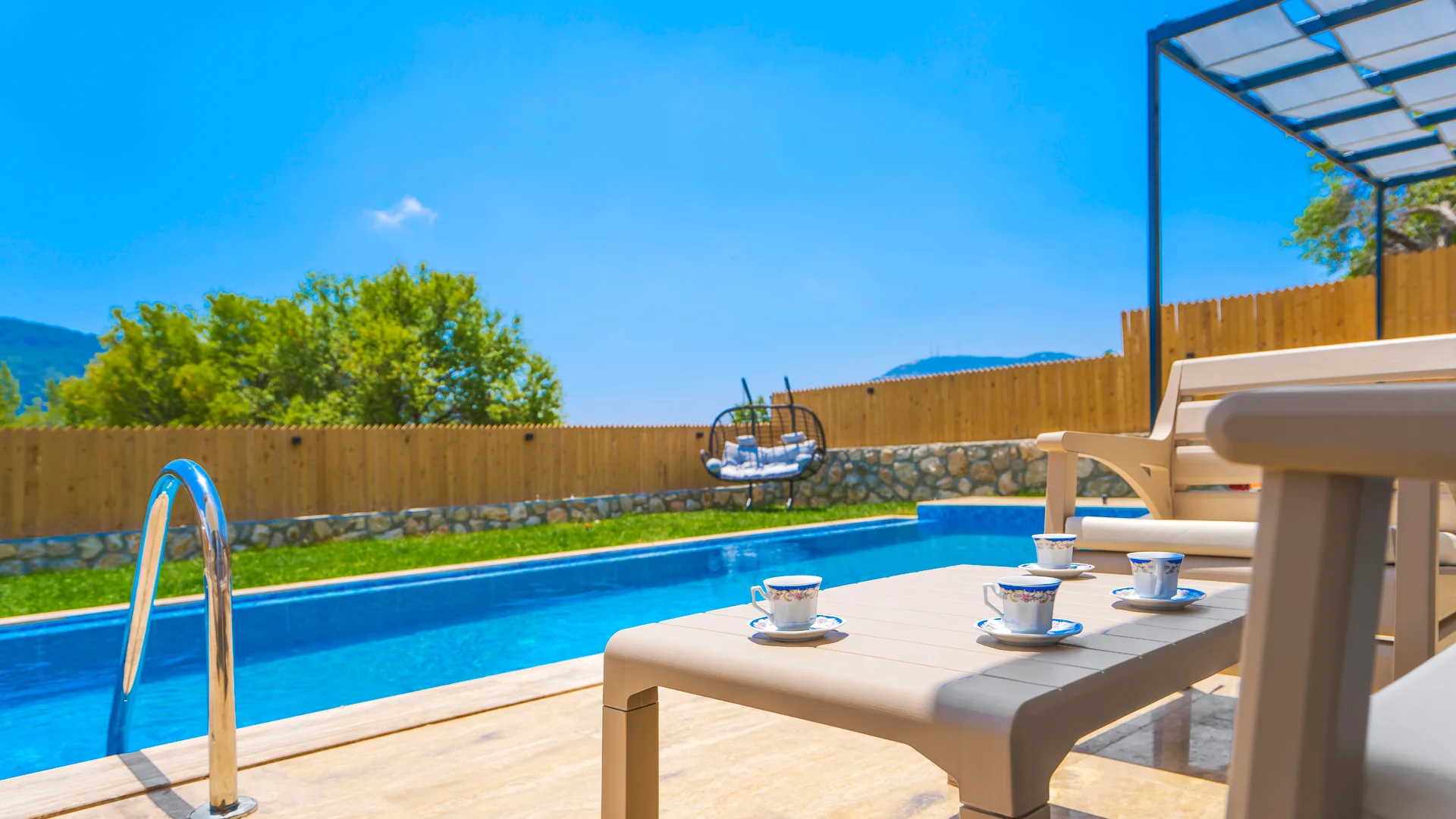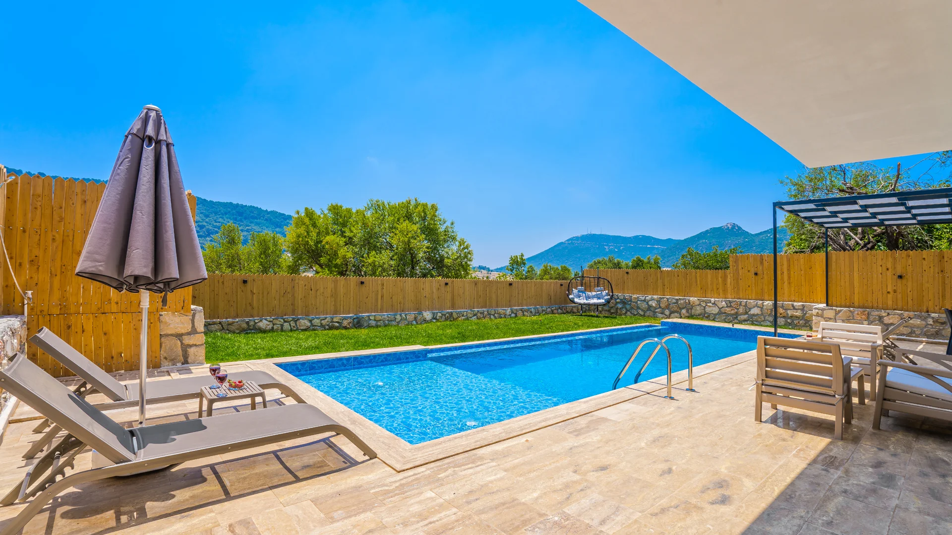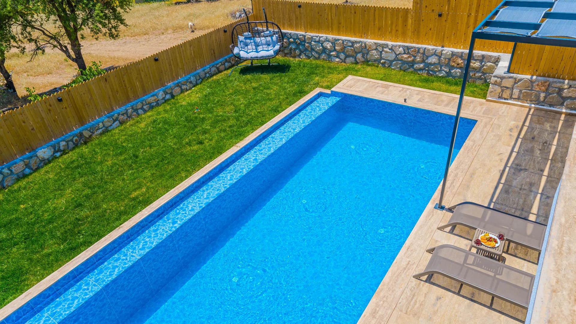 Offers a private pool and garden area with visibility from outside largely restricted.