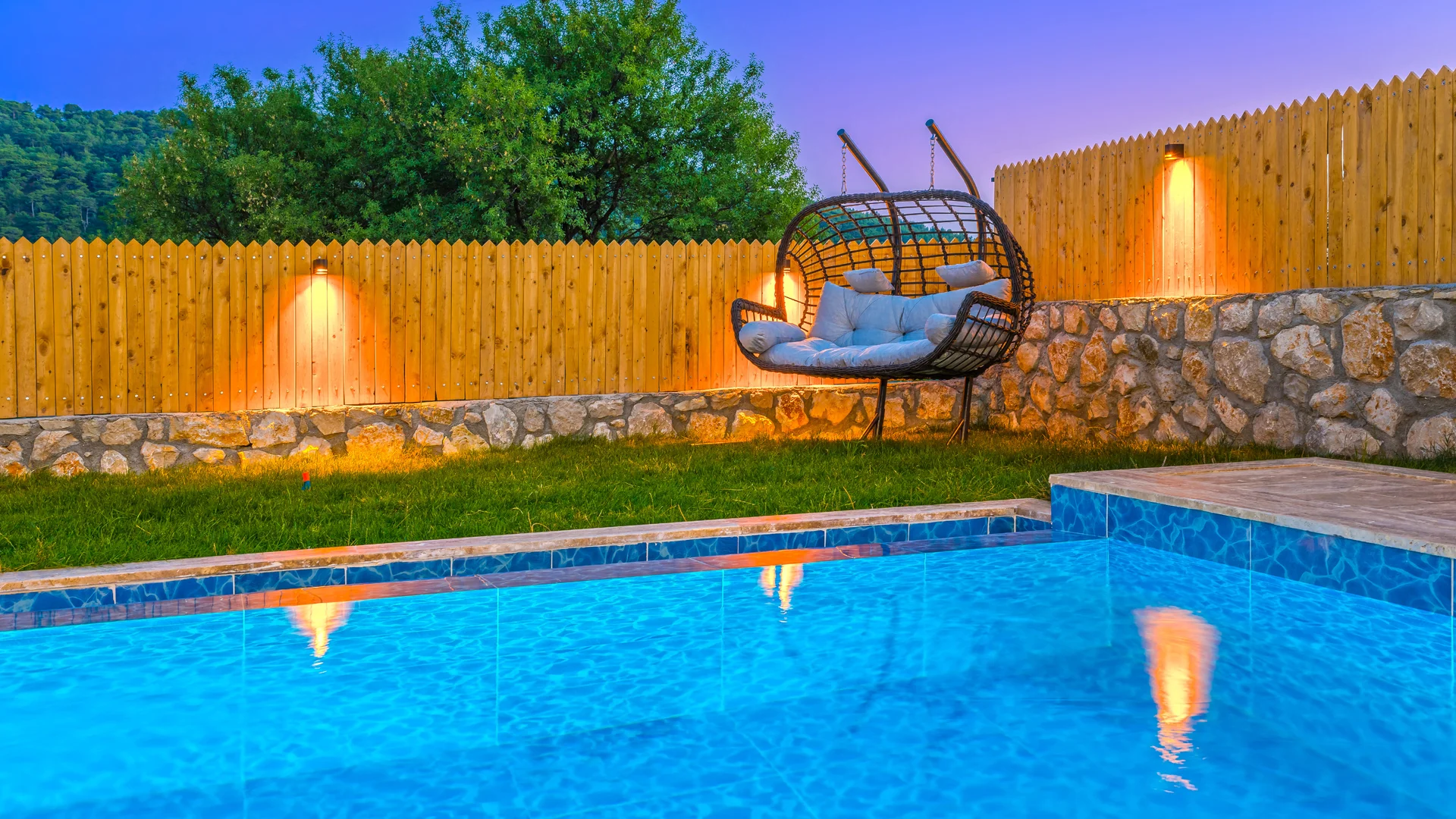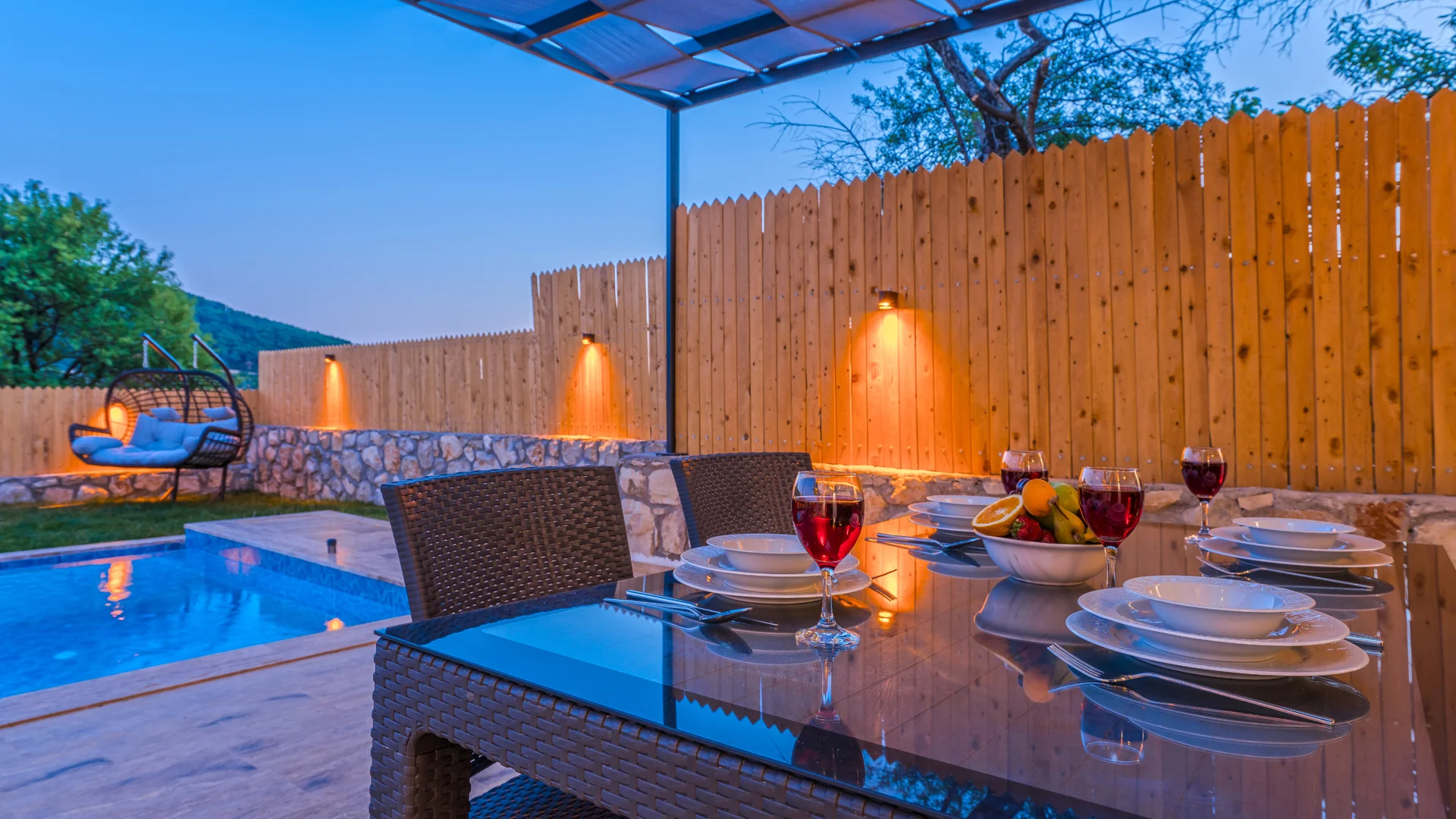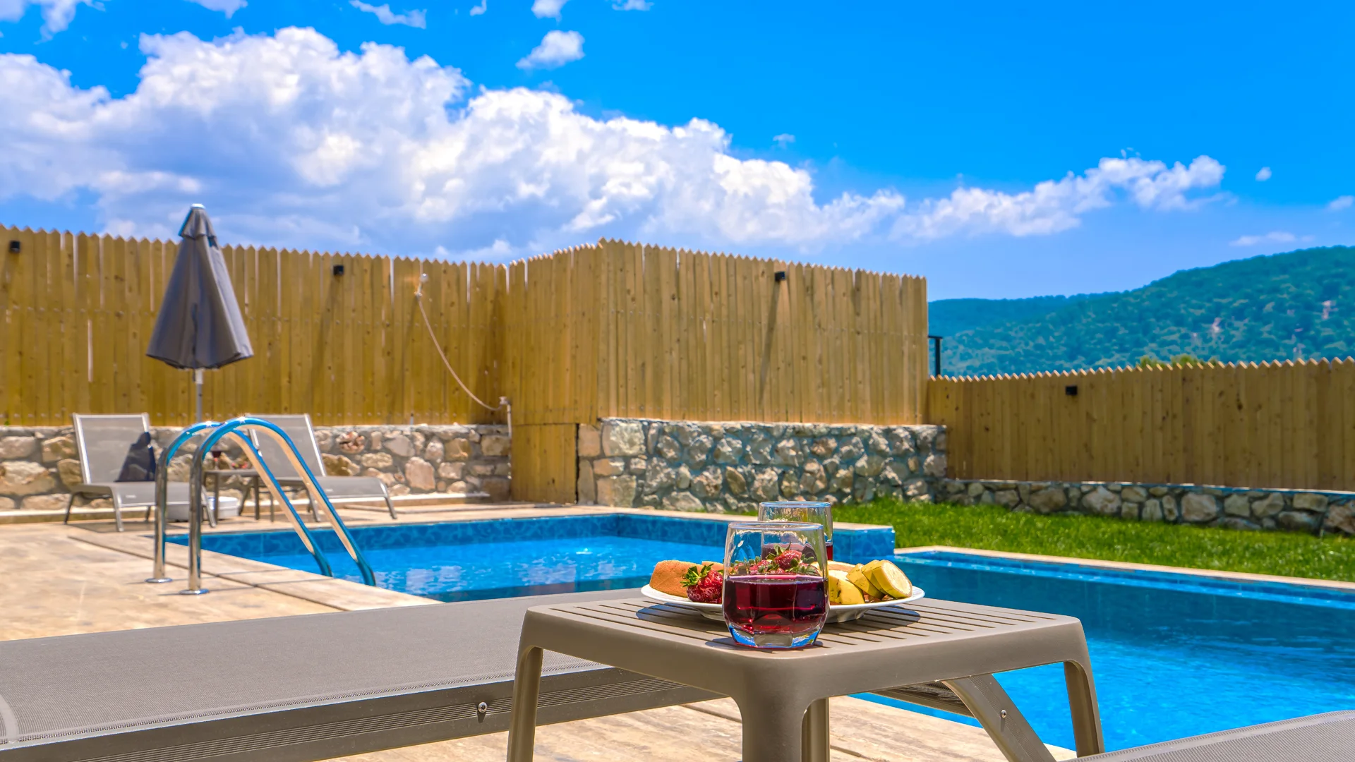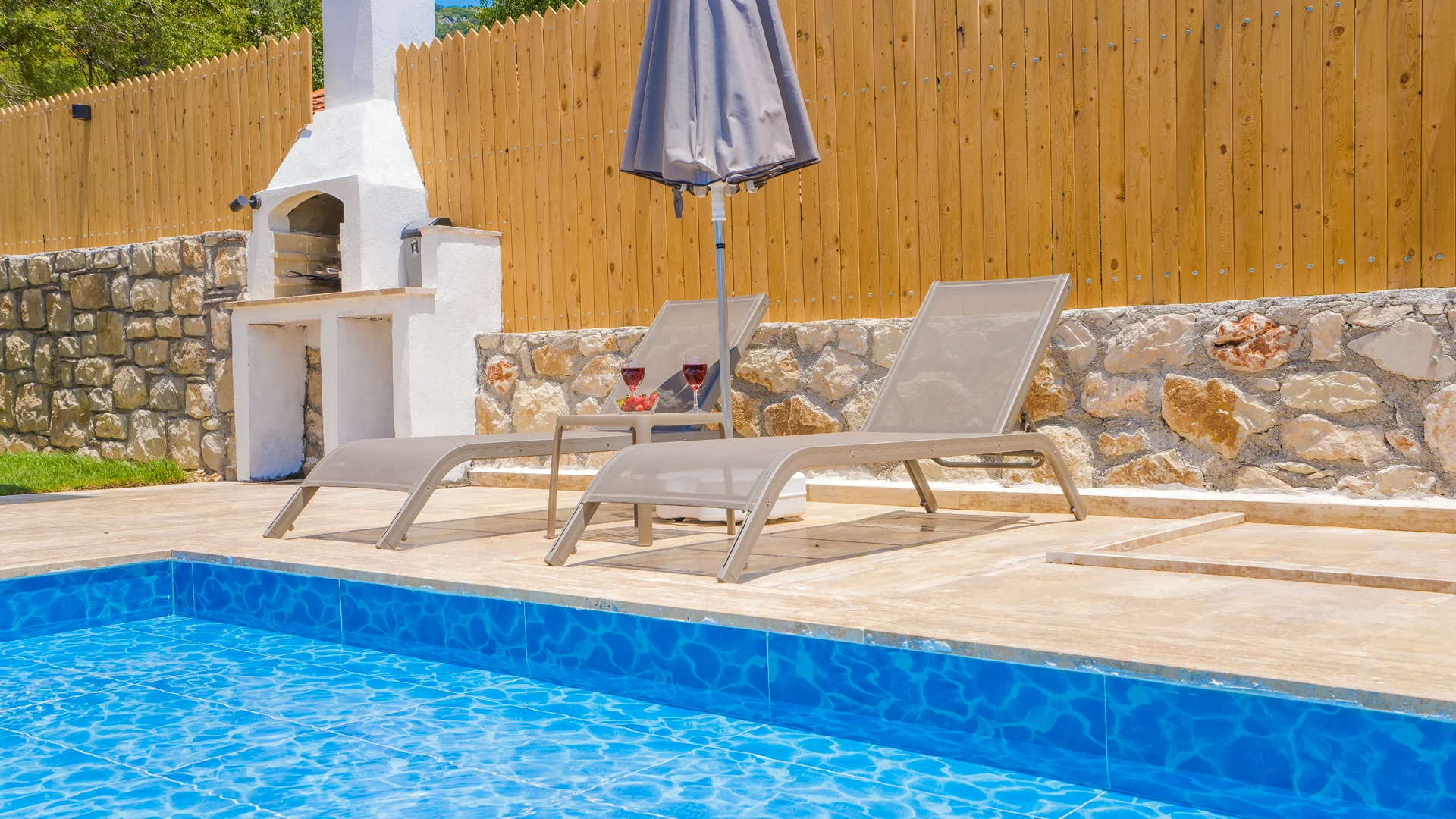 Offers a private pool and garden area with visibility from outside largely restricted.