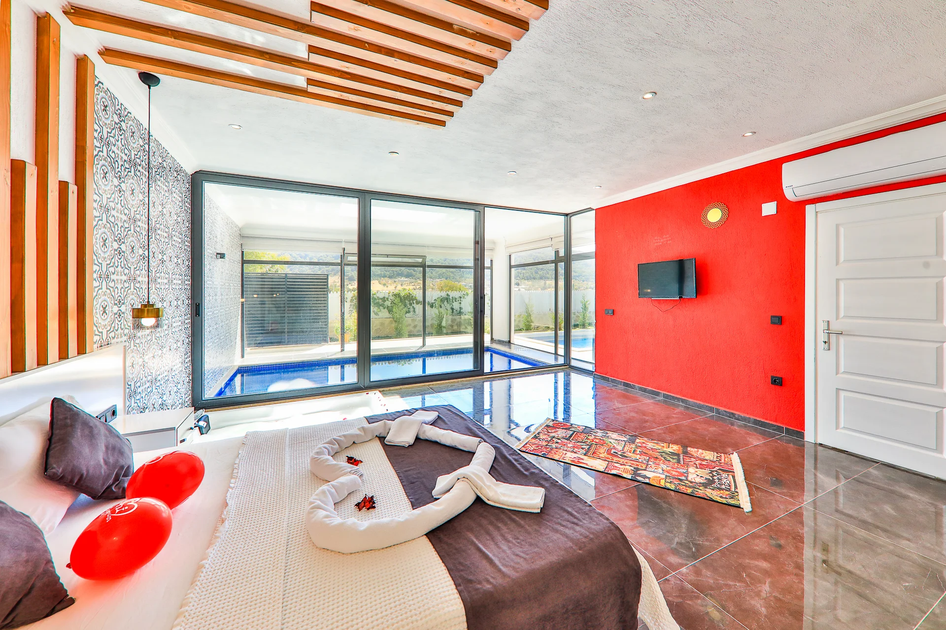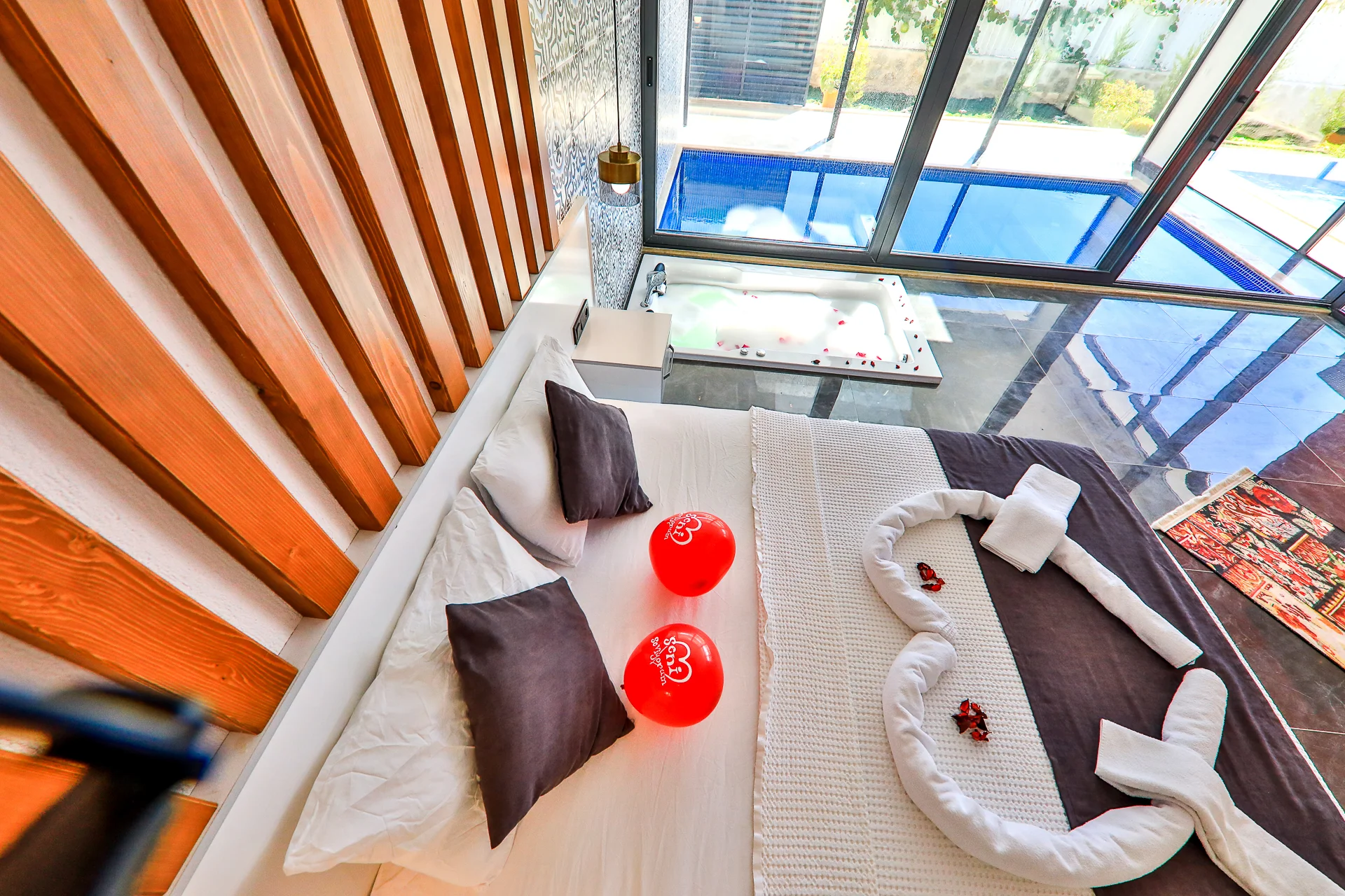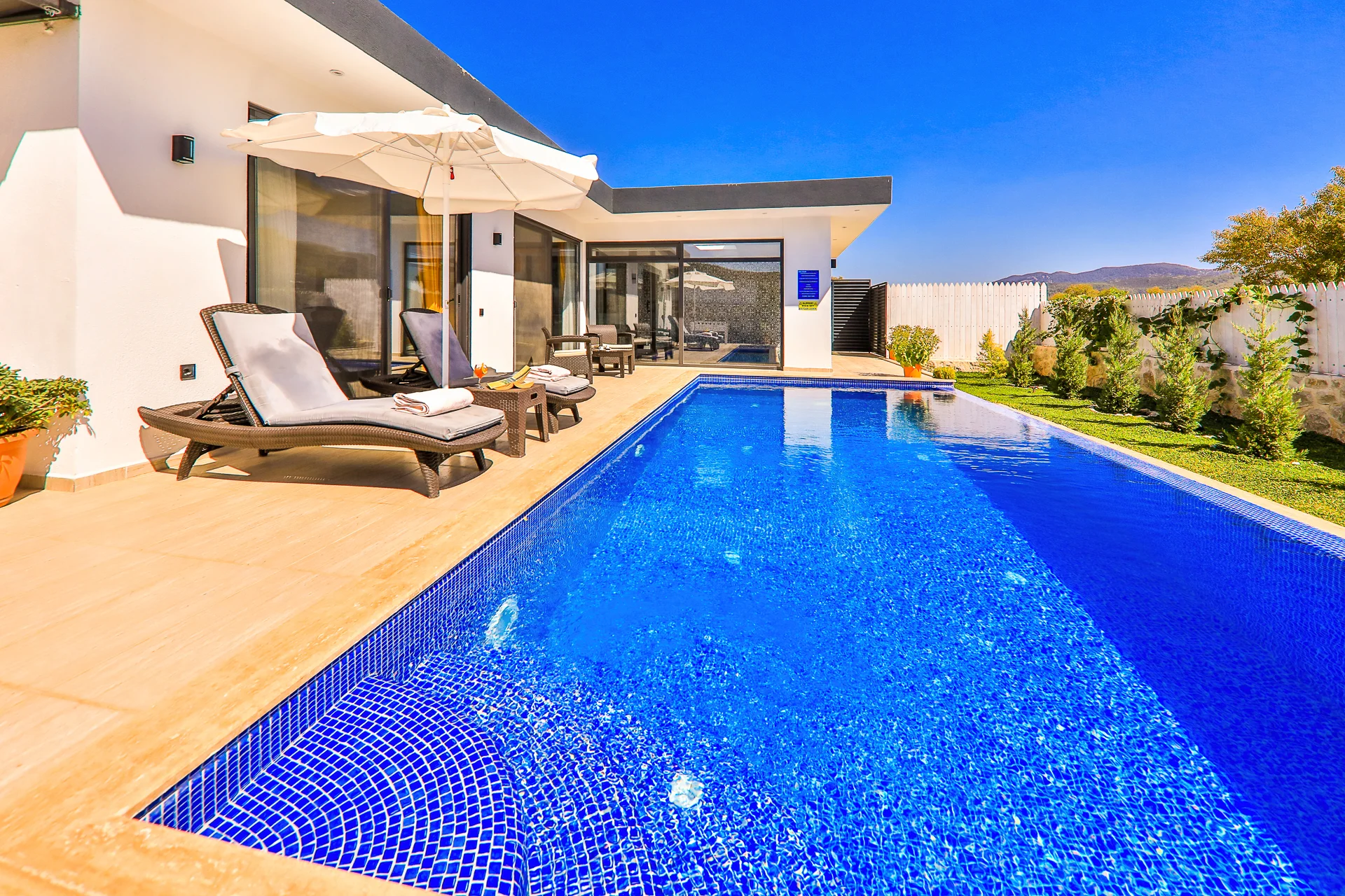 Kalkan’ın sakin ve doğayla iç içe Sarıbelen bölgesinde yer alan Villa Terra, 2 kişilik kapasitesiyle özellikle balayı çiftleri ve muhafazakâr misafirler için ideal bir tatil seçeneğidir. Tamamen korunaklı bahçe ve havuz alanına sahip olan villa, dışarıdan görünmeyen özel tasarımı sayesinde misafirlerine huzurlu, konforlu ve özgür bir tatil deneyimi sunar. Villada bir adet geniş yatak odası, jakuzi, sauna, hamam, ısıtmalı kapalı havuz ve özel yüzme havuzu bulunmaktadır. Bu donanımlar sayesinde, yılın her mevsiminde keyifli bir tatil yapma imkânı sunar. Villanın modern iç mimarisi, zarif mobilyalarla tamamlanmış olup, romantik bir atmosfer oluşturacak şekilde özenle dekore edilmiştir.