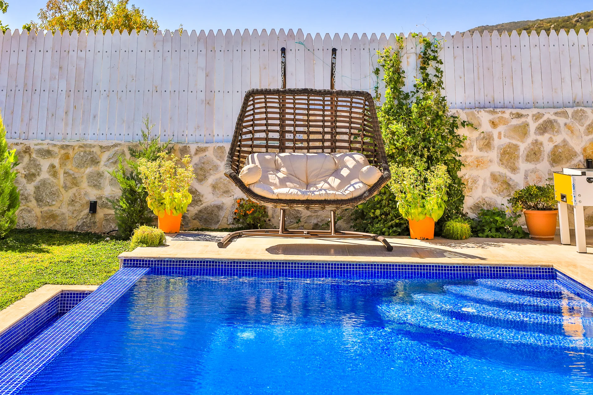 Offers a private pool and garden area with visibility from outside largely restricted.