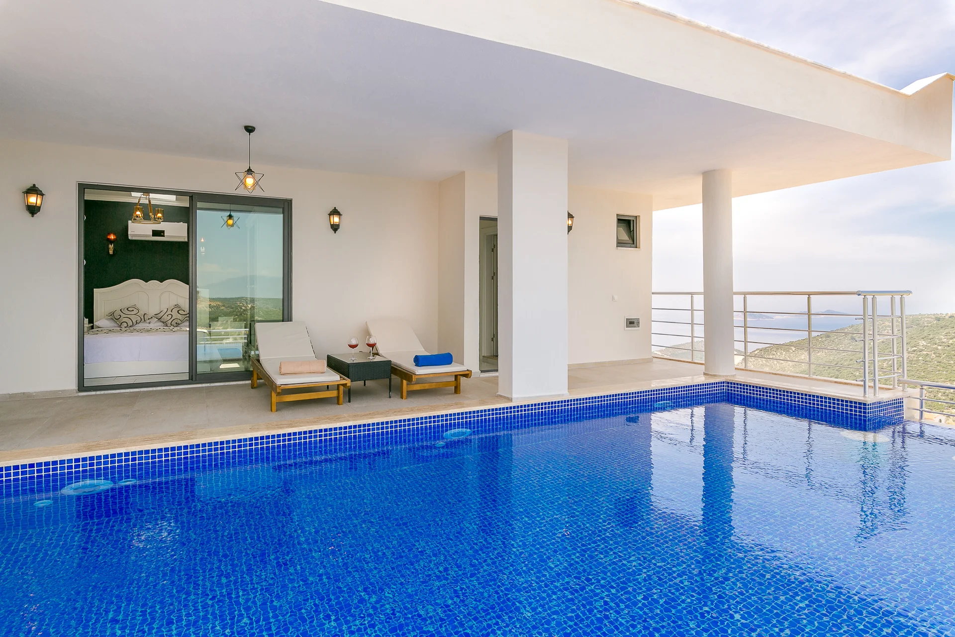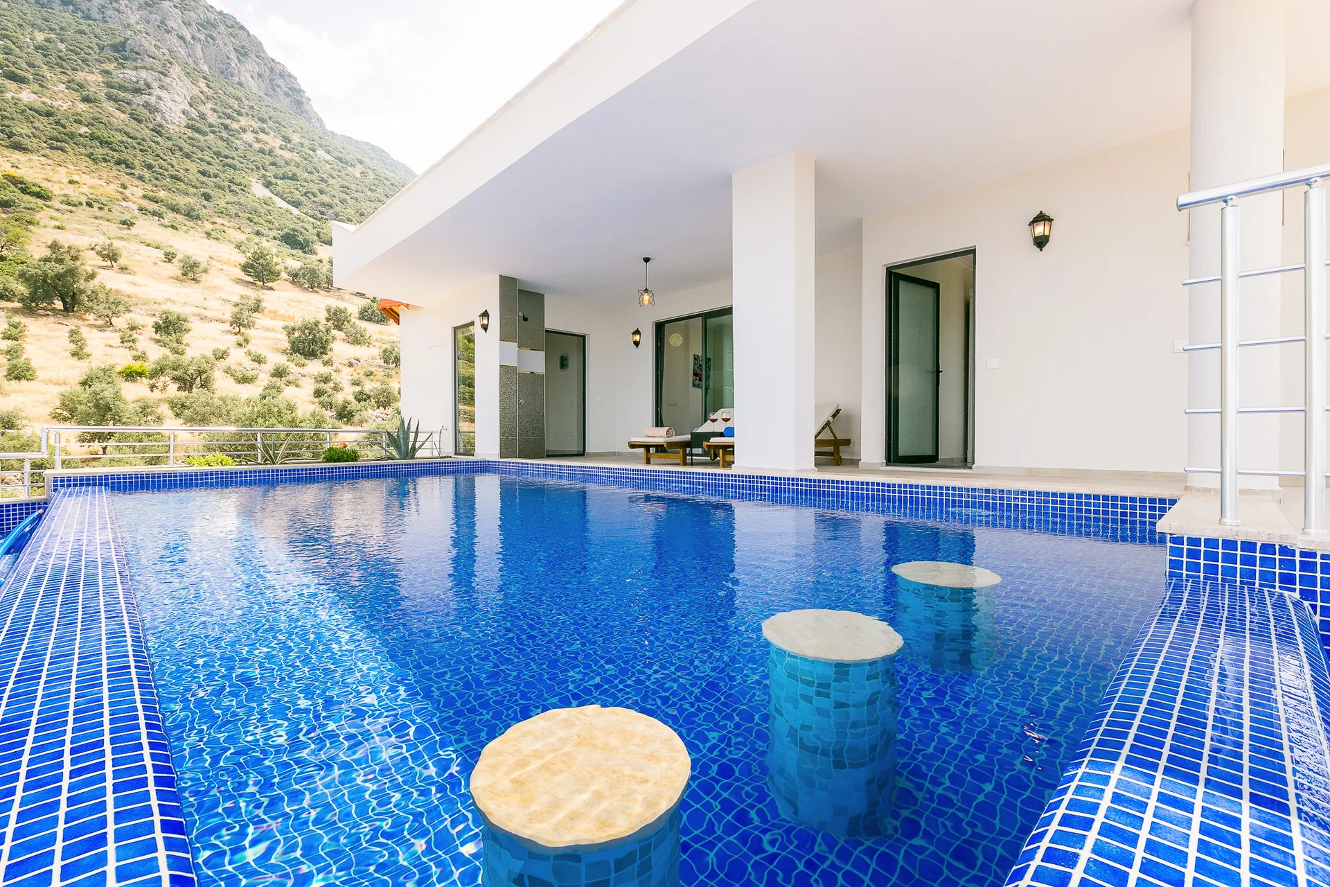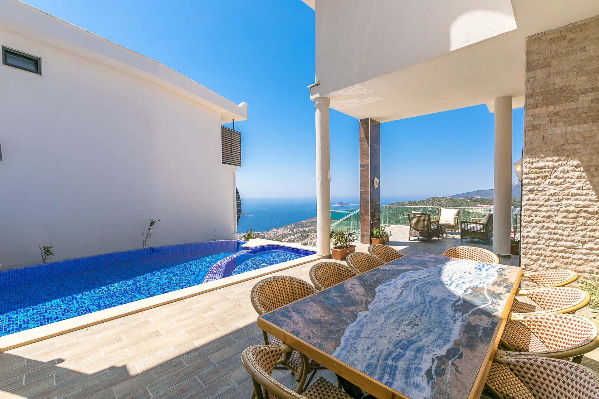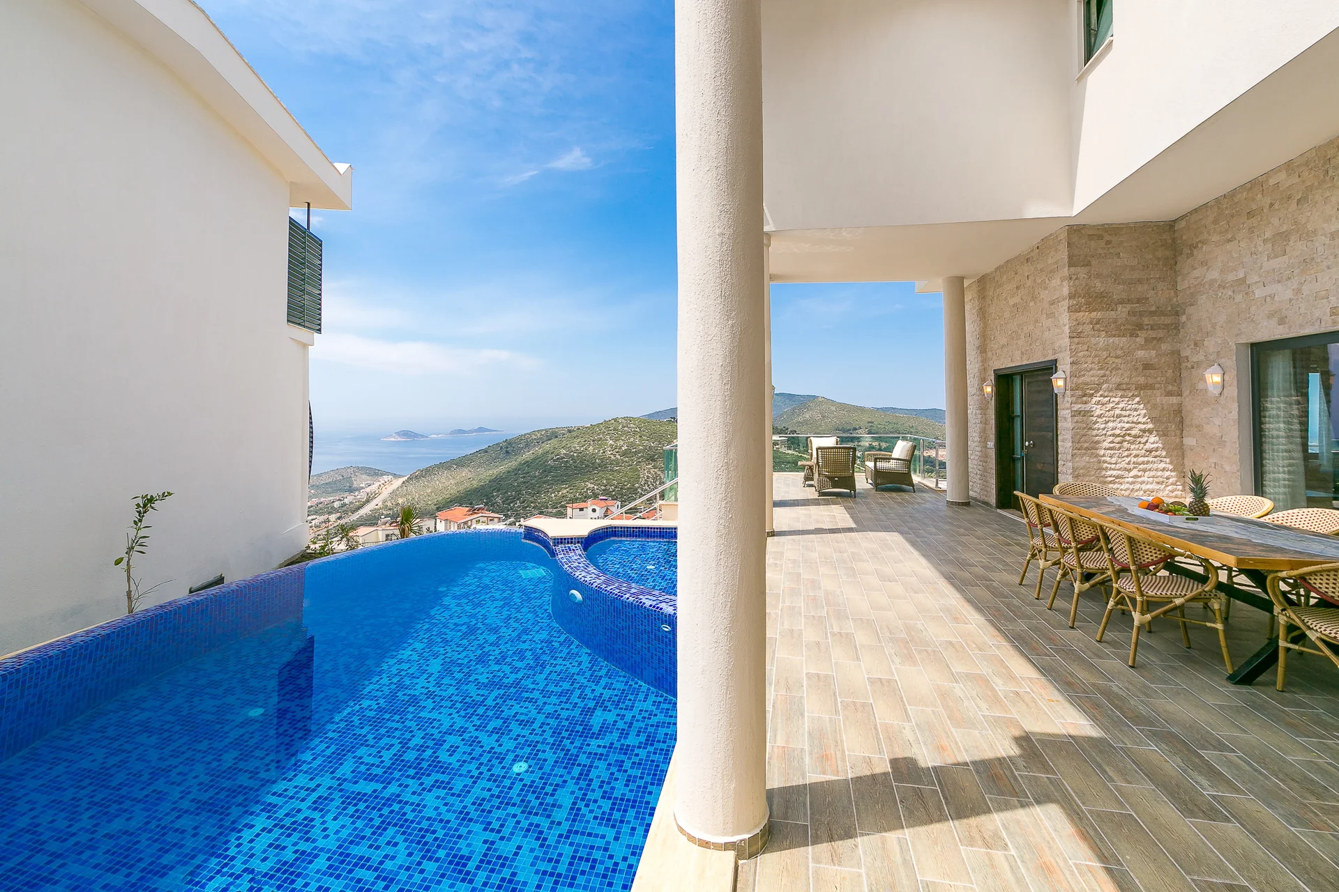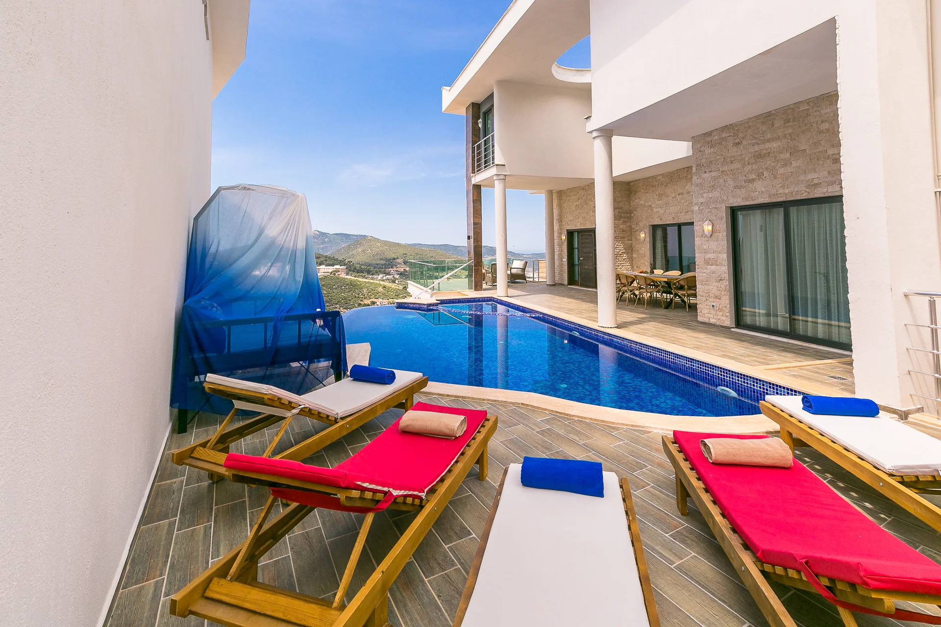 Villa Ekselans çift havuzu, taş ve sütun detaylarıyla bir villa olmanın ötesinde bir köşkü andırıyor. 10 kişi rahatlıkla tatil yapılacak şekilde tasarlanan Villa Ekselans’da tatilde villa deneyimini yaşamanız ve manzaranın tadını çıkarmanız için her şey düşünüldü. Geniş aile ve arkadaş grupları için lüks villa deneyimi Geniş aile ve arkadaş grupları için lüks villa deneyimi... Villa Ekselans'ın sonsuzluk havuzundan Akdeniz'in sonsuz mavisine bakarken rengarenk bir günbatımıyla karşılaşacaksınız. Terasta bulunan yemek masasında bir akşam yemeği ile bu manzaranın tadını çıkarabilirsiniz. Üst havuz:8*4 Derinlik:0,90 Havuz Ebatları: 10*5 m Derinlik:1*50 GİRİŞ: 16:00 ÇIKIŞ: 10:00 Sitemizde çocuk oyun parkı bulunmaktadır. Site girişimiz 24 saat güvenlik kameralarıyla izlenmektedir.
