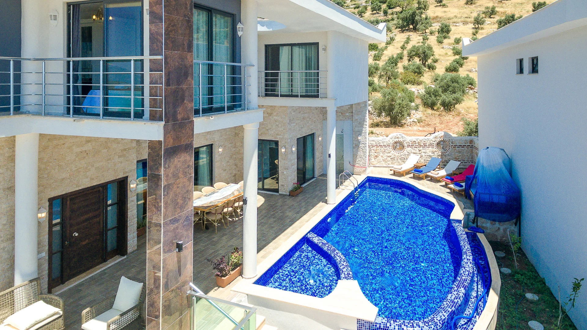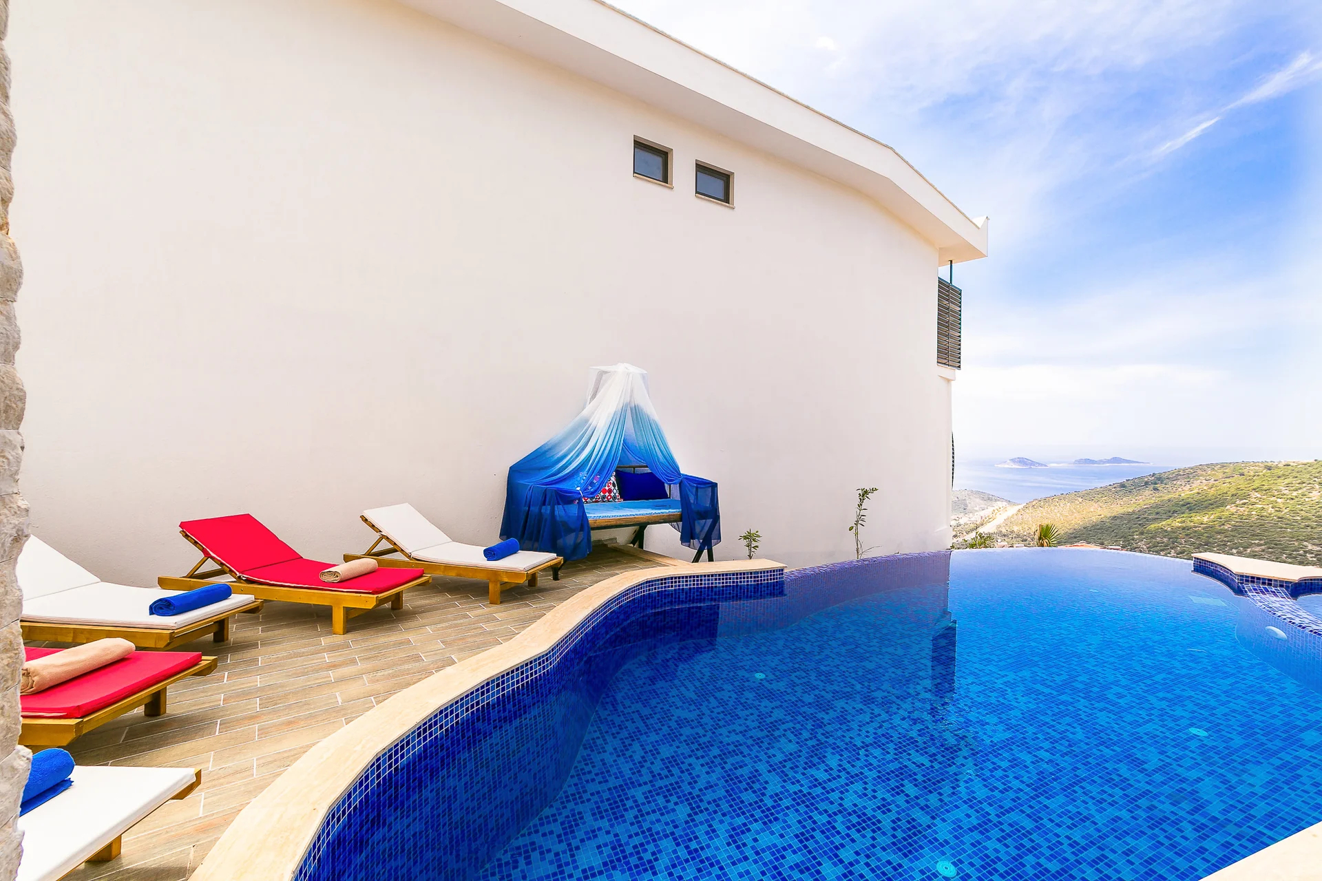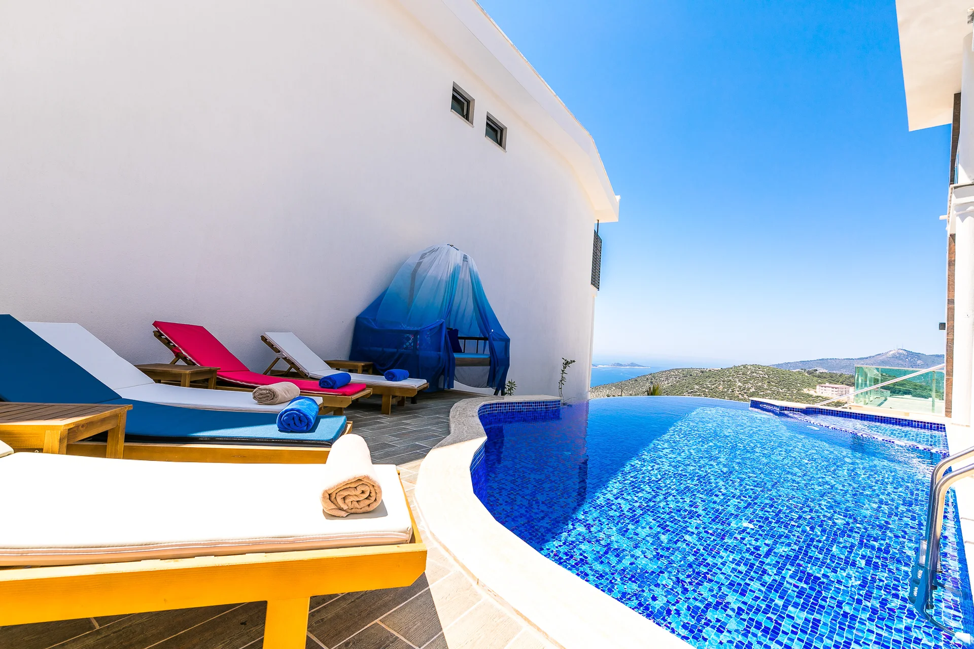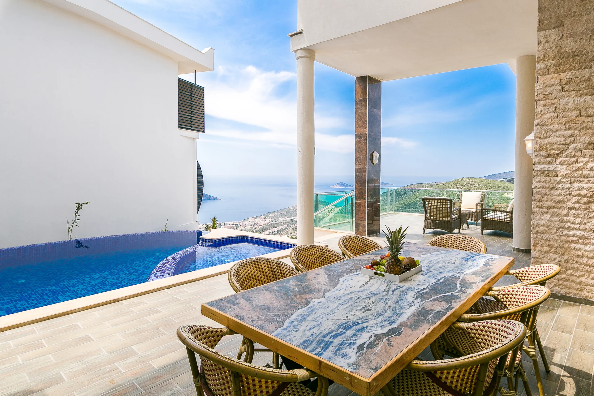 Villa Ekselans çift havuzu, taş ve sütun detaylarıyla bir villa olmanın ötesinde bir köşkü andırıyor. 10 kişi rahatlıkla tatil yapılacak şekilde tasarlanan Villa Ekselans’da tatilde villa deneyimini yaşamanız ve manzaranın tadını çıkarmanız için her şey düşünüldü. Geniş aile ve arkadaş grupları için lüks villa deneyimi Geniş aile ve arkadaş grupları için lüks villa deneyimi... Villa Ekselans'ın sonsuzluk havuzundan Akdeniz'in sonsuz mavisine bakarken rengarenk bir günbatımıyla karşılaşacaksınız. Terasta bulunan yemek masasında bir akşam yemeği ile bu manzaranın tadını çıkarabilirsiniz. Üst havuz:8*4 Derinlik:0,90 Havuz Ebatları: 10*5 m Derinlik:1*50 GİRİŞ: 16:00 ÇIKIŞ: 10:00 Sitemizde çocuk oyun parkı bulunmaktadır. Site girişimiz 24 saat güvenlik kameralarıyla izlenmektedir.