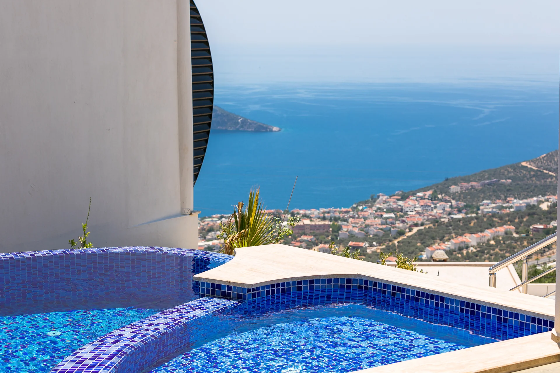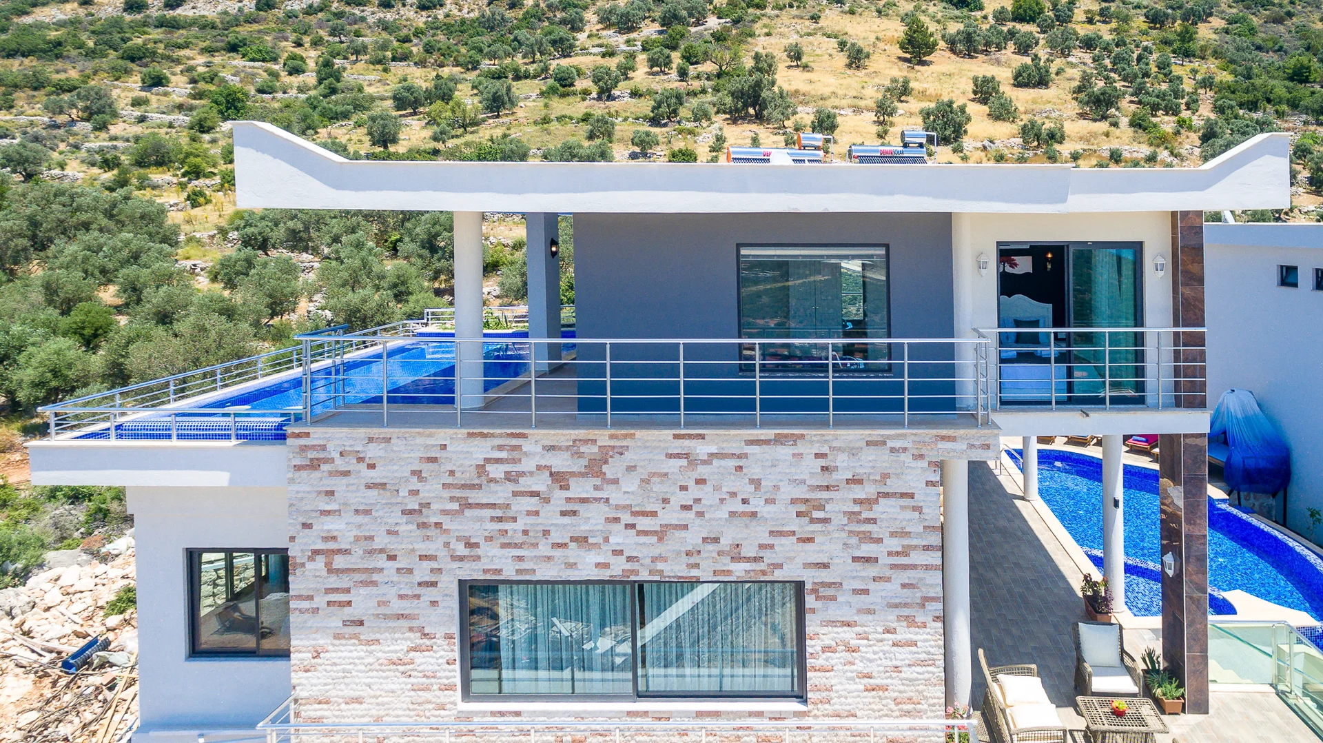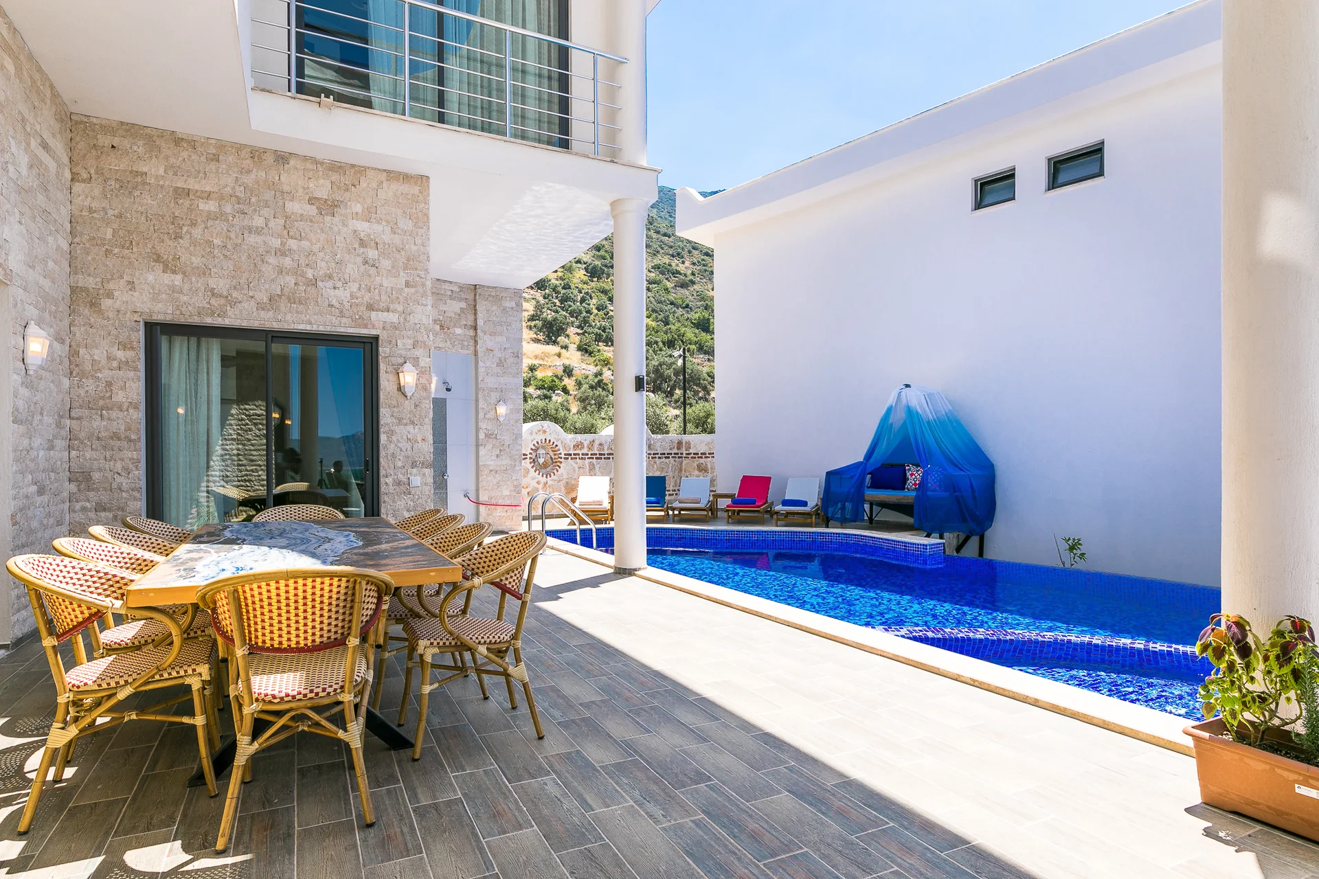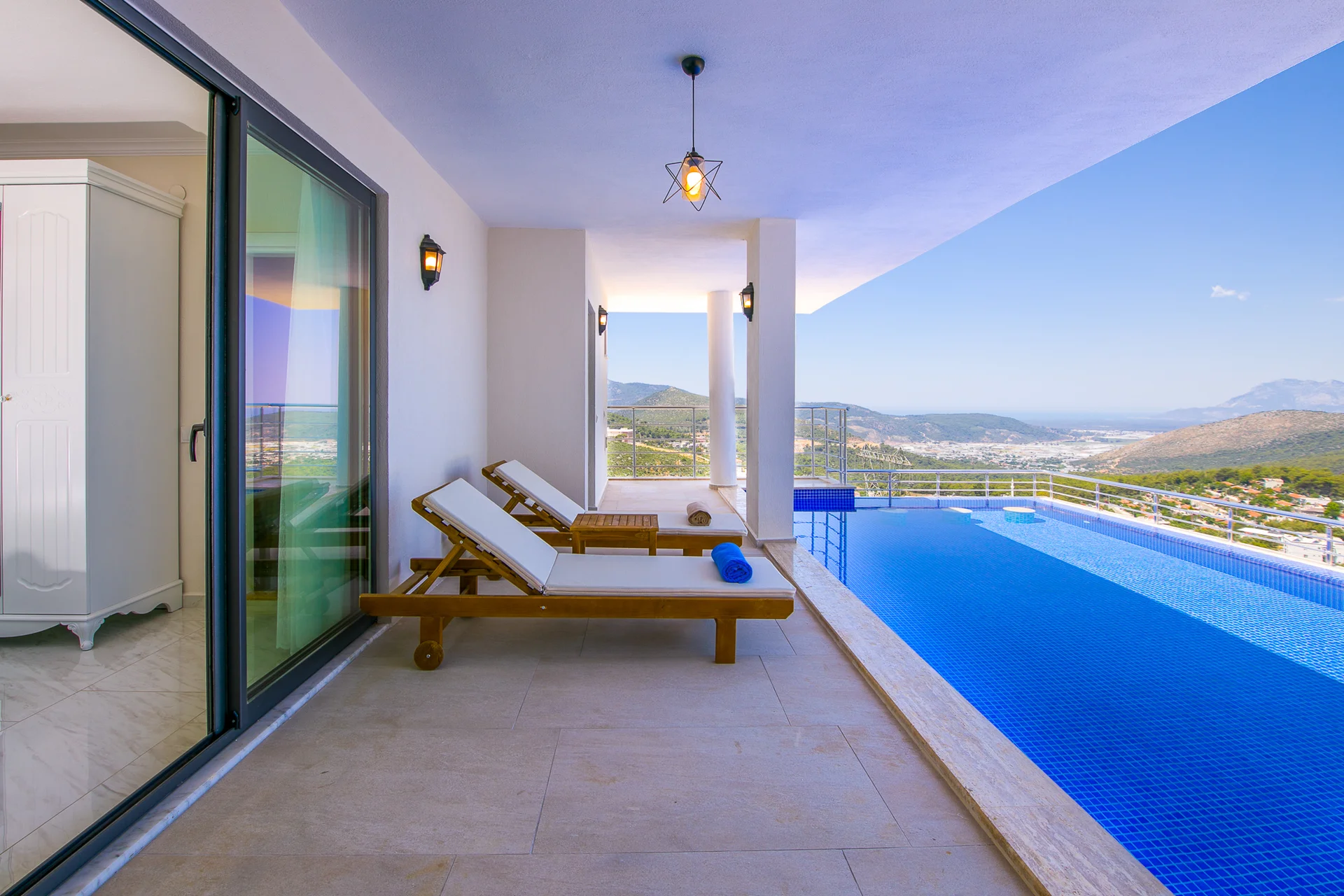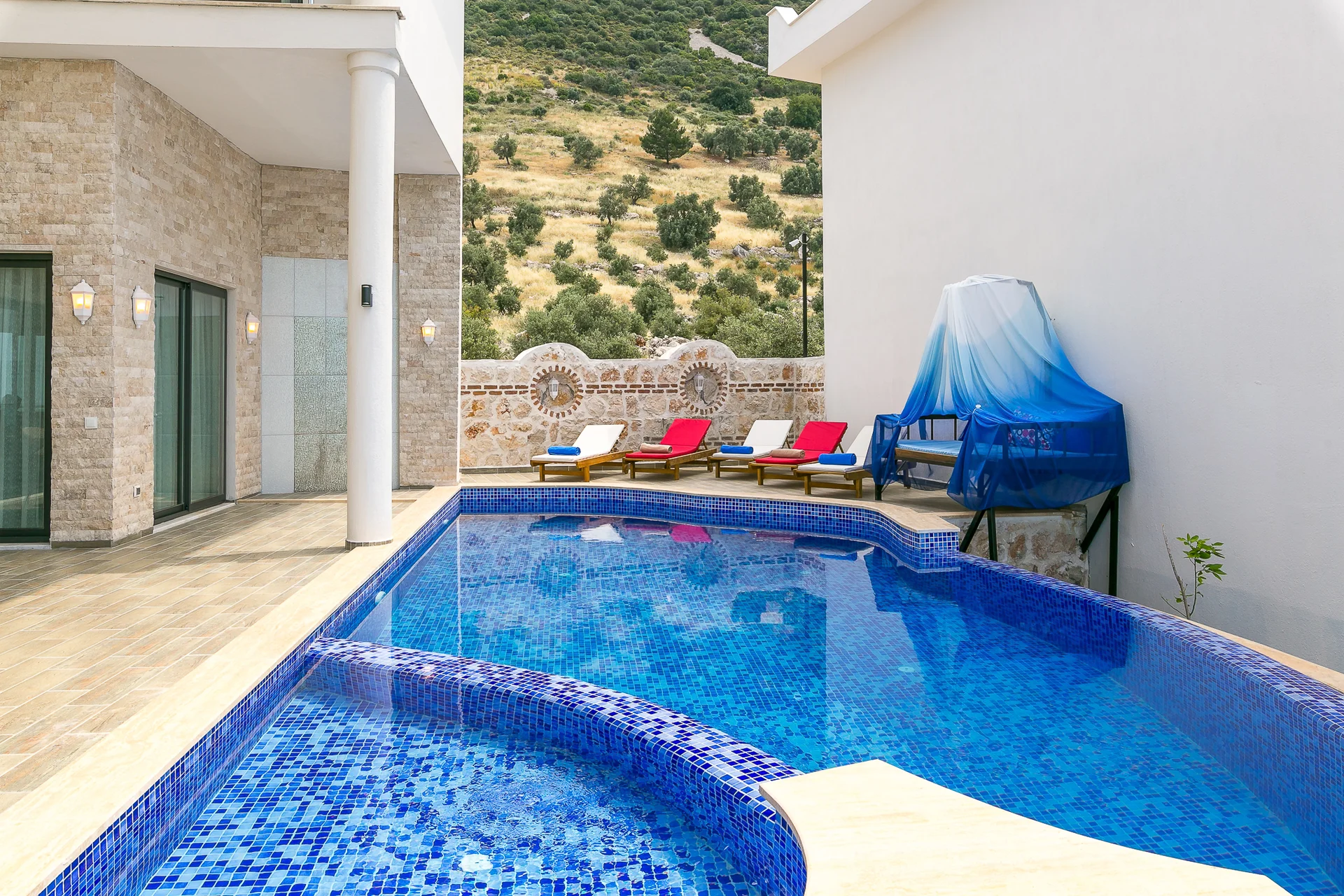 Villa Ekselans çift havuzu, taş ve sütun detaylarıyla bir villa olmanın ötesinde bir köşkü andırıyor. 10 kişi rahatlıkla tatil yapılacak şekilde tasarlanan Villa Ekselans’da tatilde villa deneyimini yaşamanız ve manzaranın tadını çıkarmanız için her şey düşünüldü. Geniş aile ve arkadaş grupları için lüks villa deneyimi Geniş aile ve arkadaş grupları için lüks villa deneyimi... Villa Ekselans'ın sonsuzluk havuzundan Akdeniz'in sonsuz mavisine bakarken rengarenk bir günbatımıyla karşılaşacaksınız. Terasta bulunan yemek masasında bir akşam yemeği ile bu manzaranın tadını çıkarabilirsiniz. Üst havuz:8*4 Derinlik:0,90 Havuz Ebatları: 10*5 m Derinlik:1*50 GİRİŞ: 16:00 ÇIKIŞ: 10:00 Sitemizde çocuk oyun parkı bulunmaktadır. Site girişimiz 24 saat güvenlik kameralarıyla izlenmektedir.