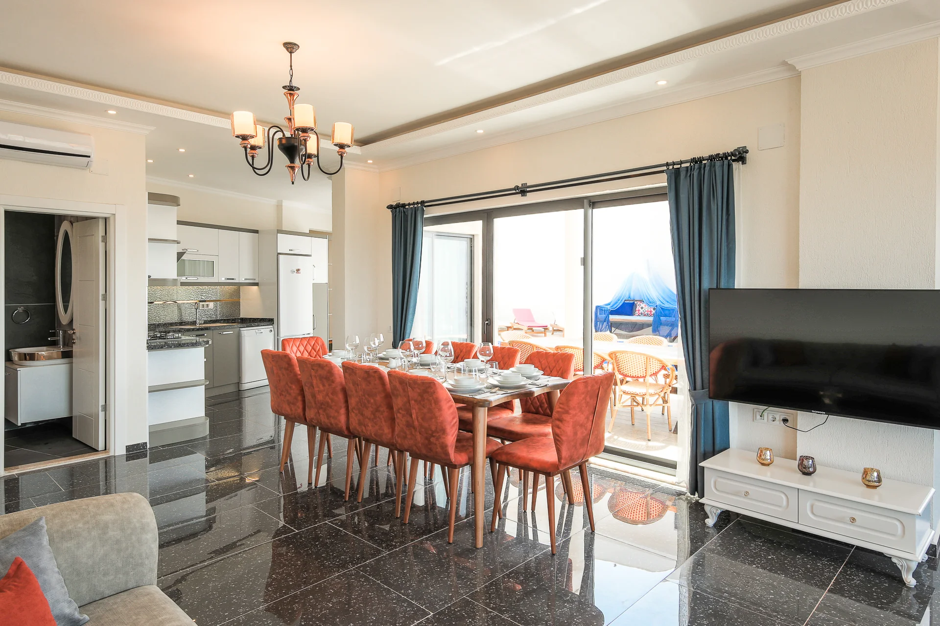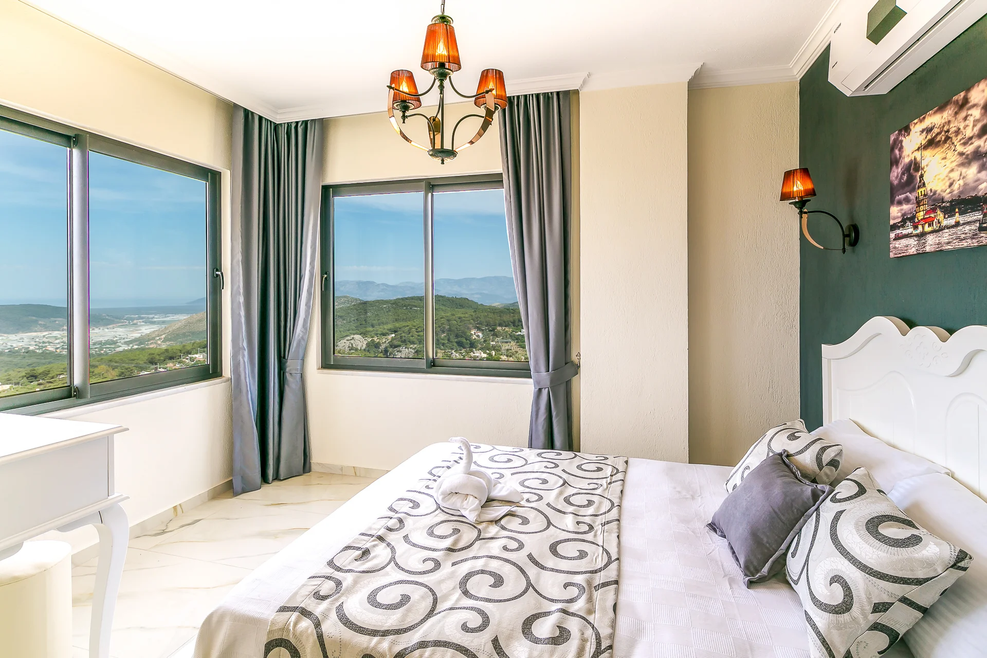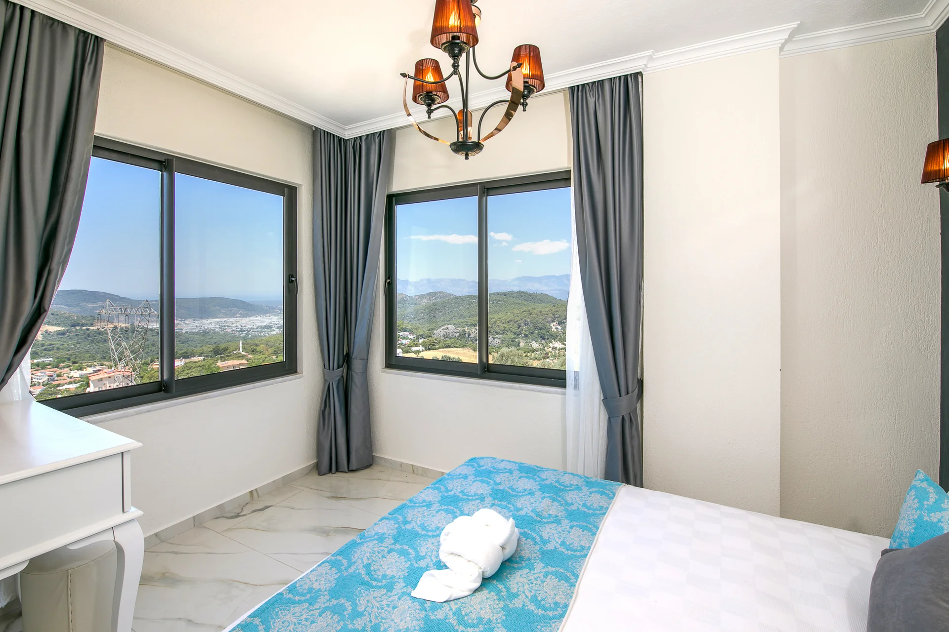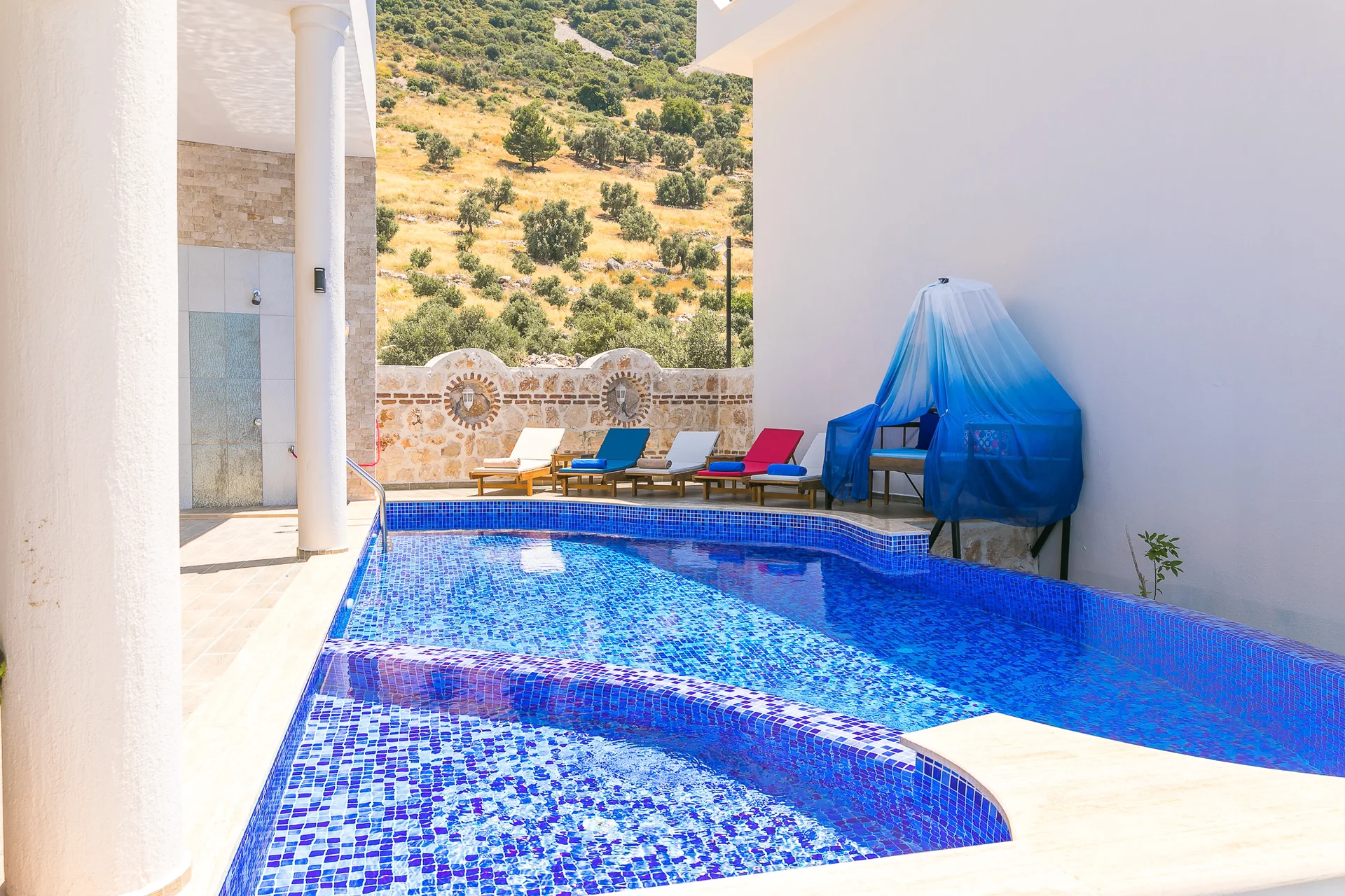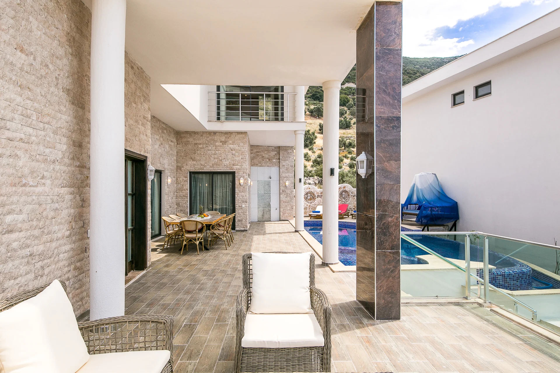 Villa Ekselans çift havuzu, taş ve sütun detaylarıyla bir villa olmanın ötesinde bir köşkü andırıyor. 10 kişi rahatlıkla tatil yapılacak şekilde tasarlanan Villa Ekselans’da tatilde villa deneyimini yaşamanız ve manzaranın tadını çıkarmanız için her şey düşünüldü. Geniş aile ve arkadaş grupları için lüks villa deneyimi Geniş aile ve arkadaş grupları için lüks villa deneyimi... Villa Ekselans'ın sonsuzluk havuzundan Akdeniz'in sonsuz mavisine bakarken rengarenk bir günbatımıyla karşılaşacaksınız. Terasta bulunan yemek masasında bir akşam yemeği ile bu manzaranın tadını çıkarabilirsiniz. Üst havuz:8*4 Derinlik:0,90 Havuz Ebatları: 10*5 m Derinlik:1*50 GİRİŞ: 16:00 ÇIKIŞ: 10:00 Sitemizde çocuk oyun parkı bulunmaktadır. Site girişimiz 24 saat güvenlik kameralarıyla izlenmektedir.